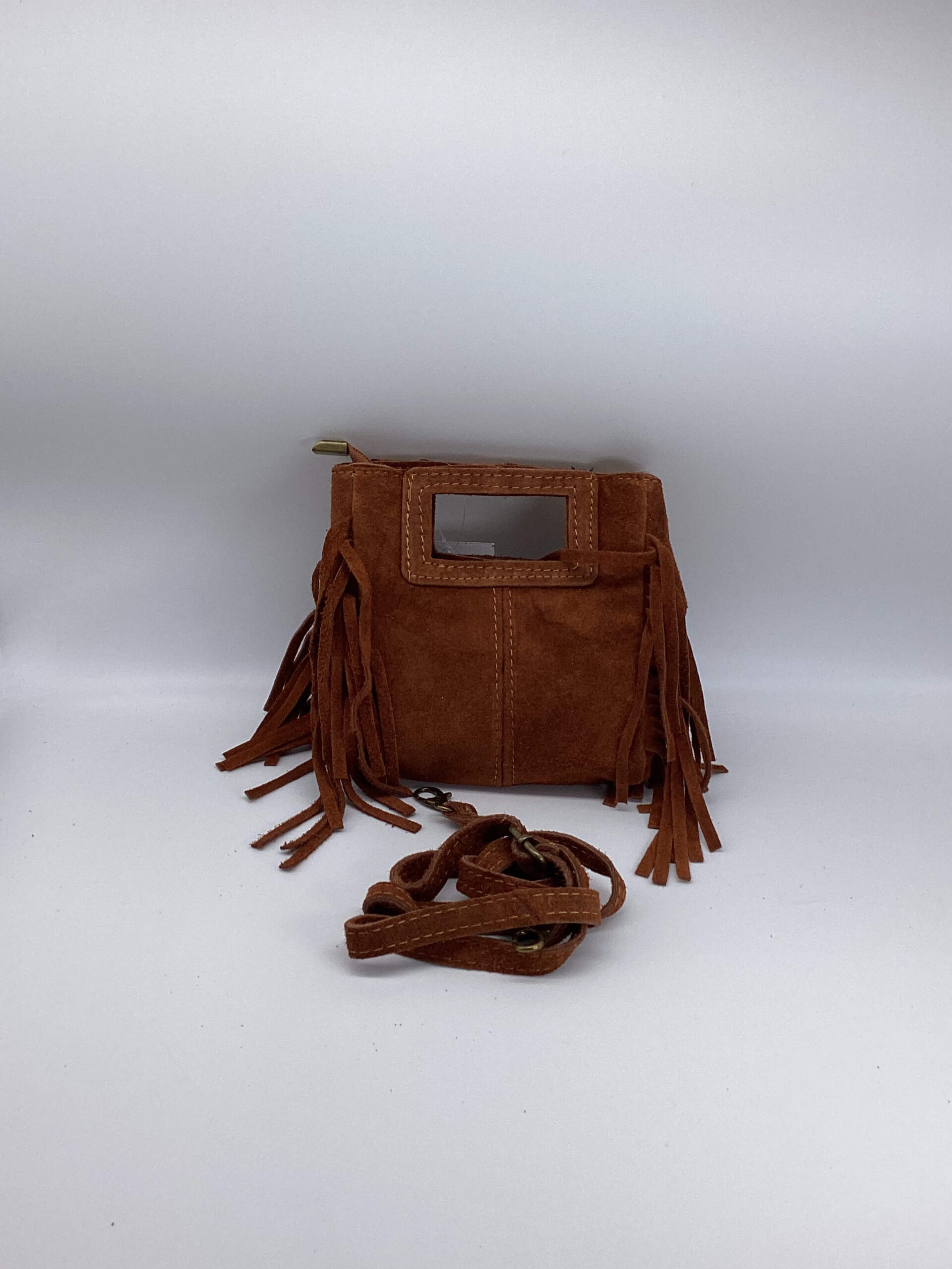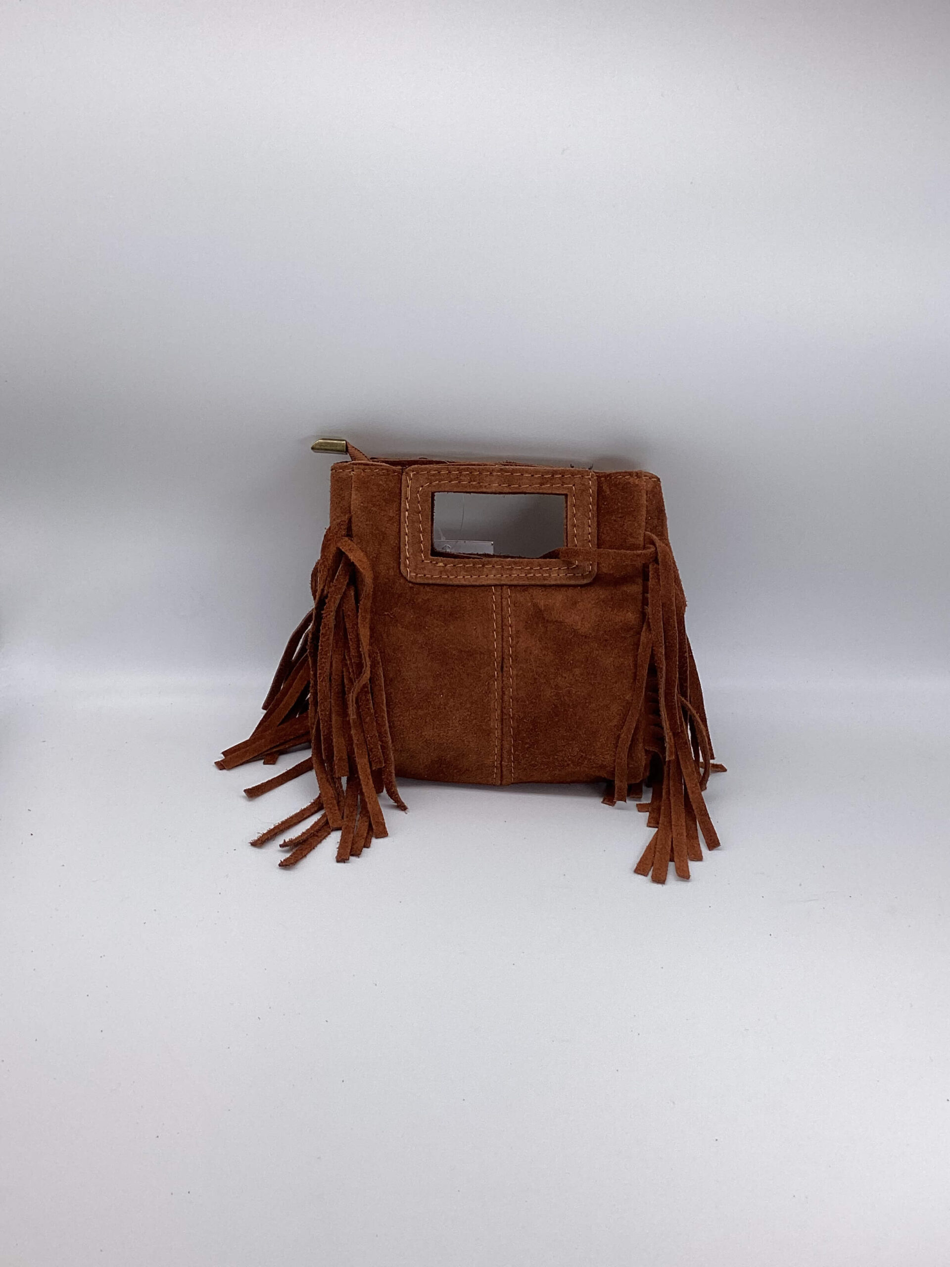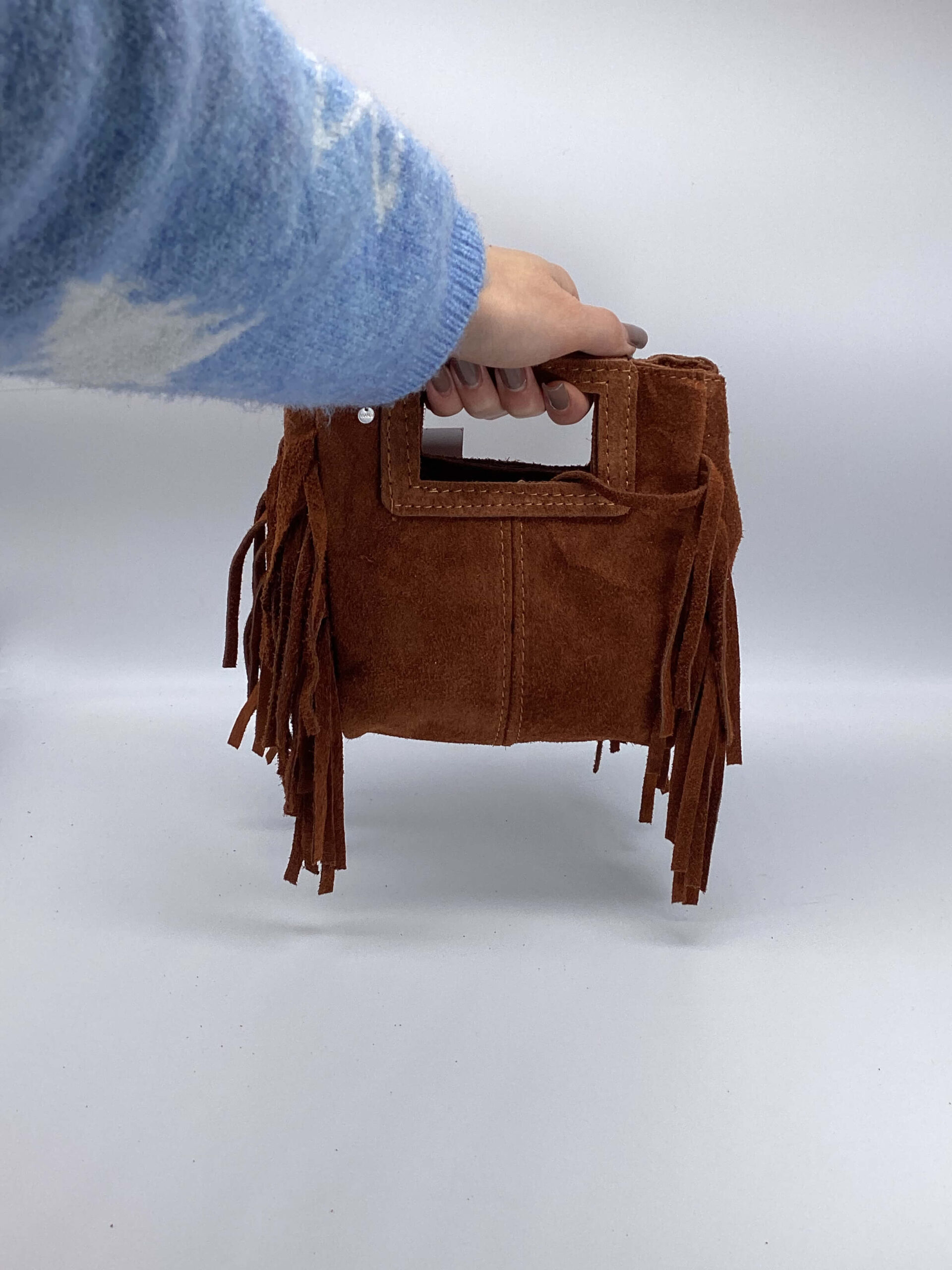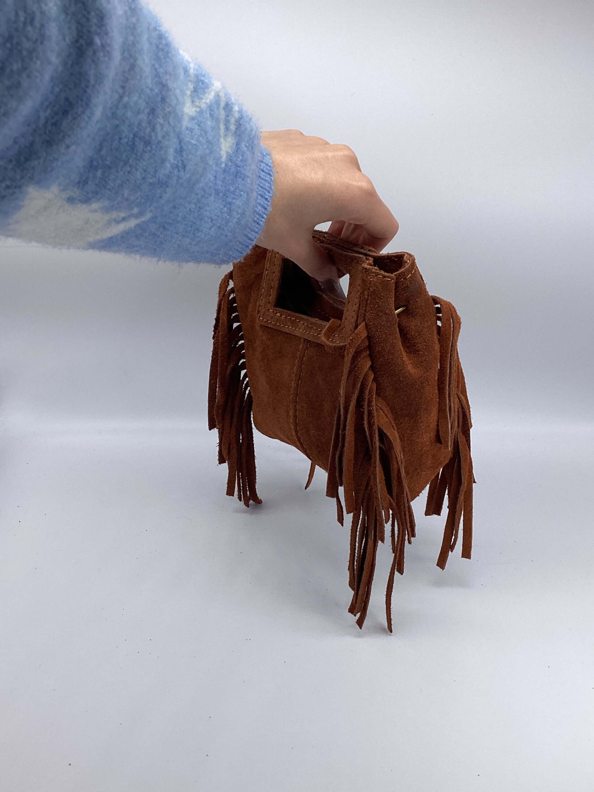 Borsa in pelle scamosciata, con frange, dettagli metallici color ottone anticato.