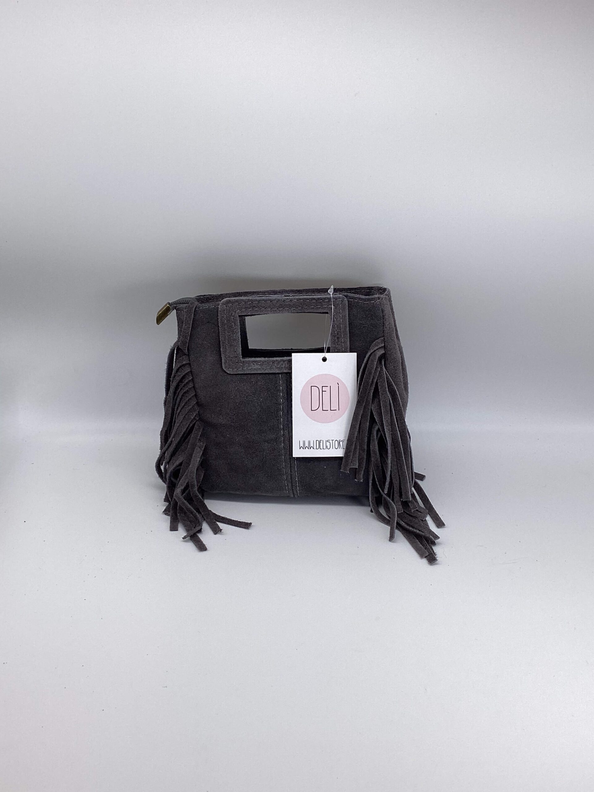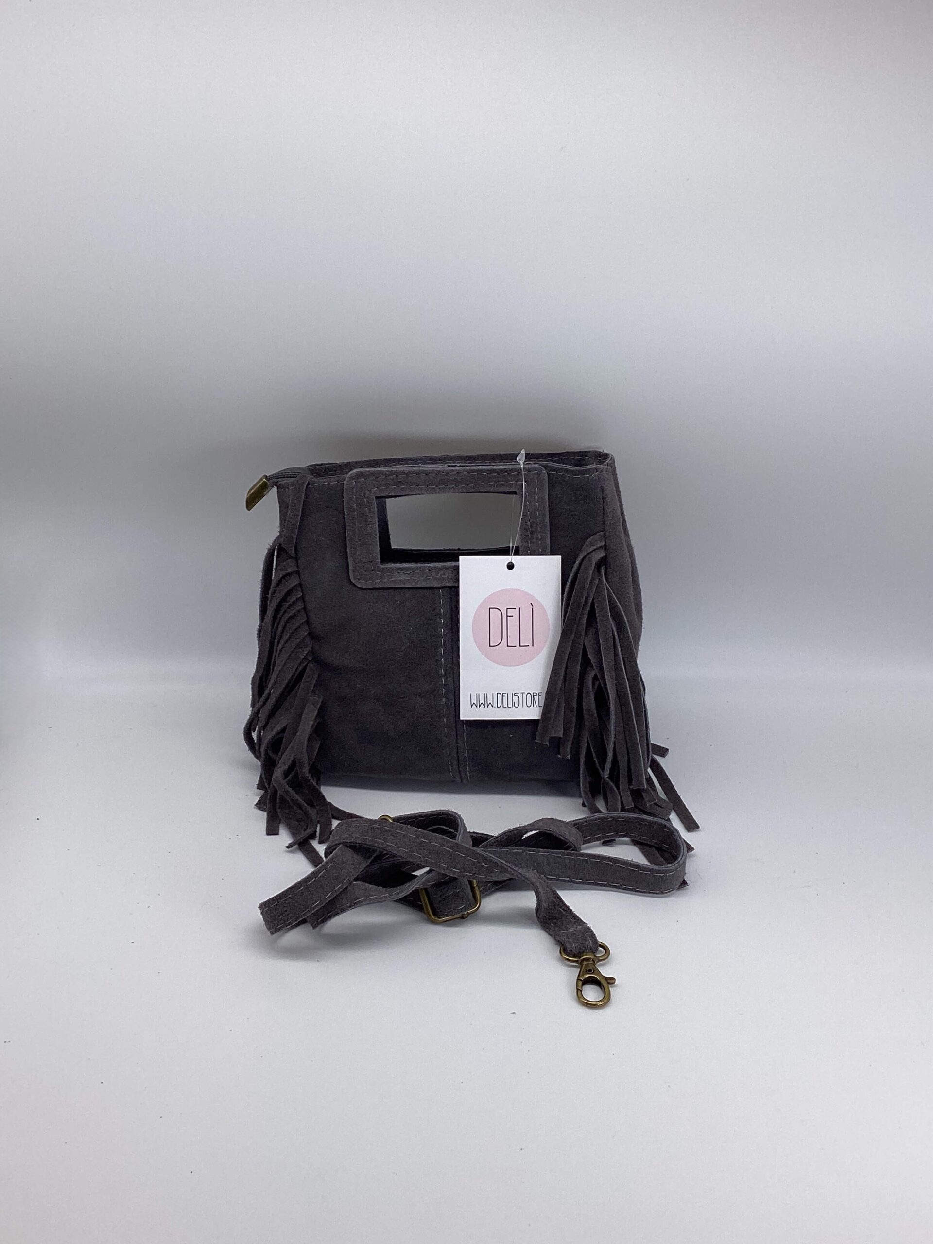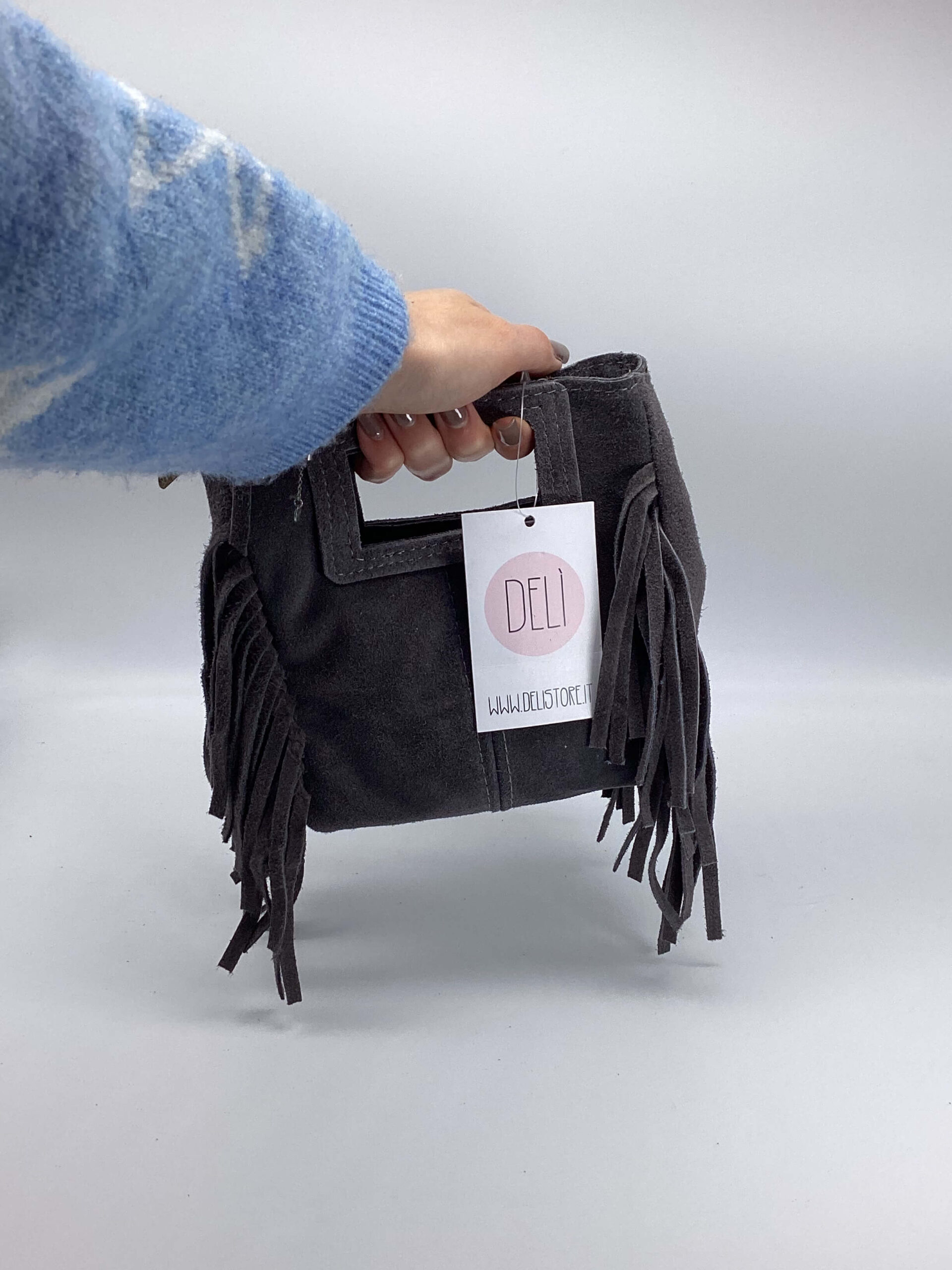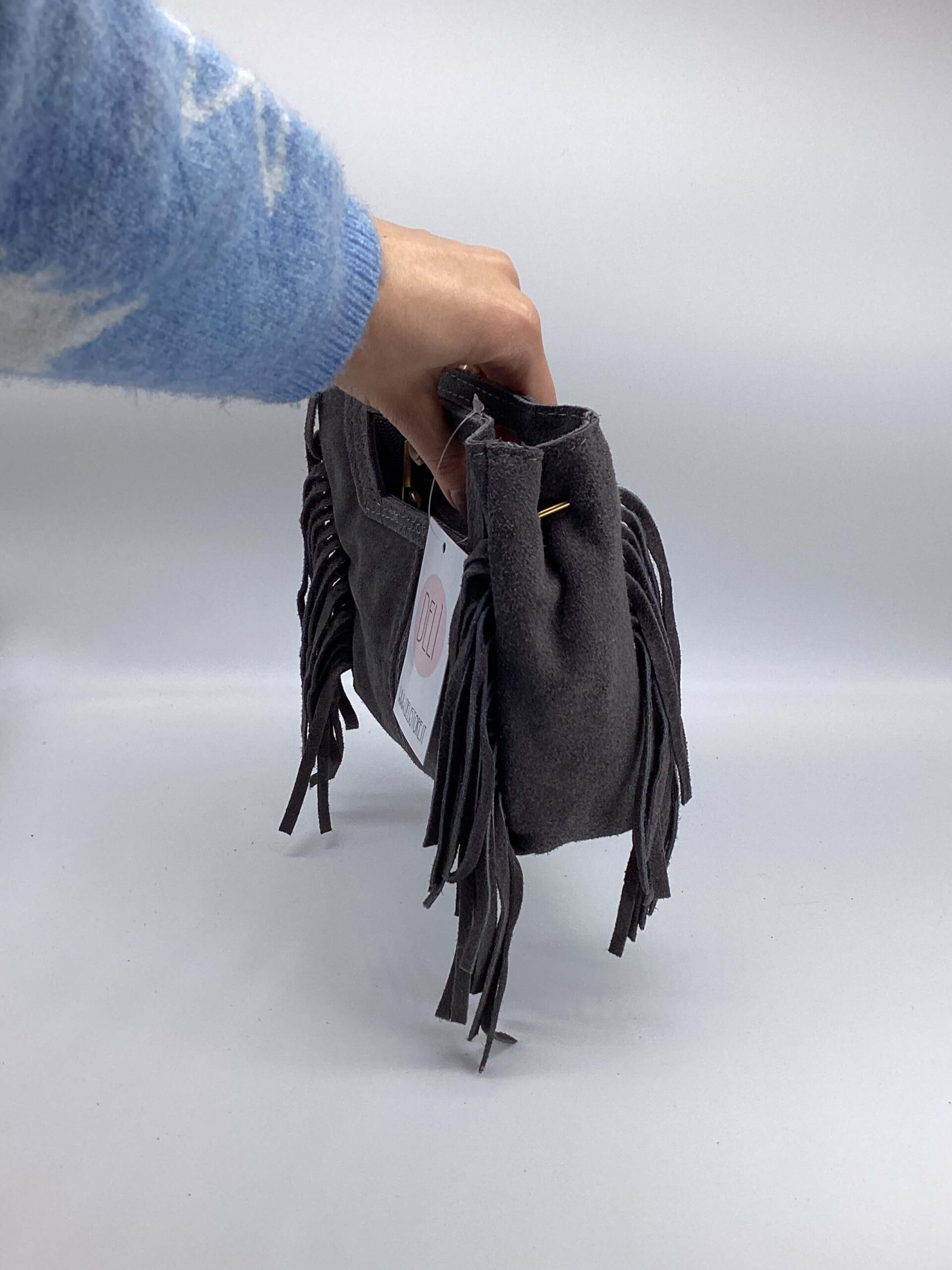 Borsa in pelle scamosciata, con frange, dettagli metallici color ottone anticato.