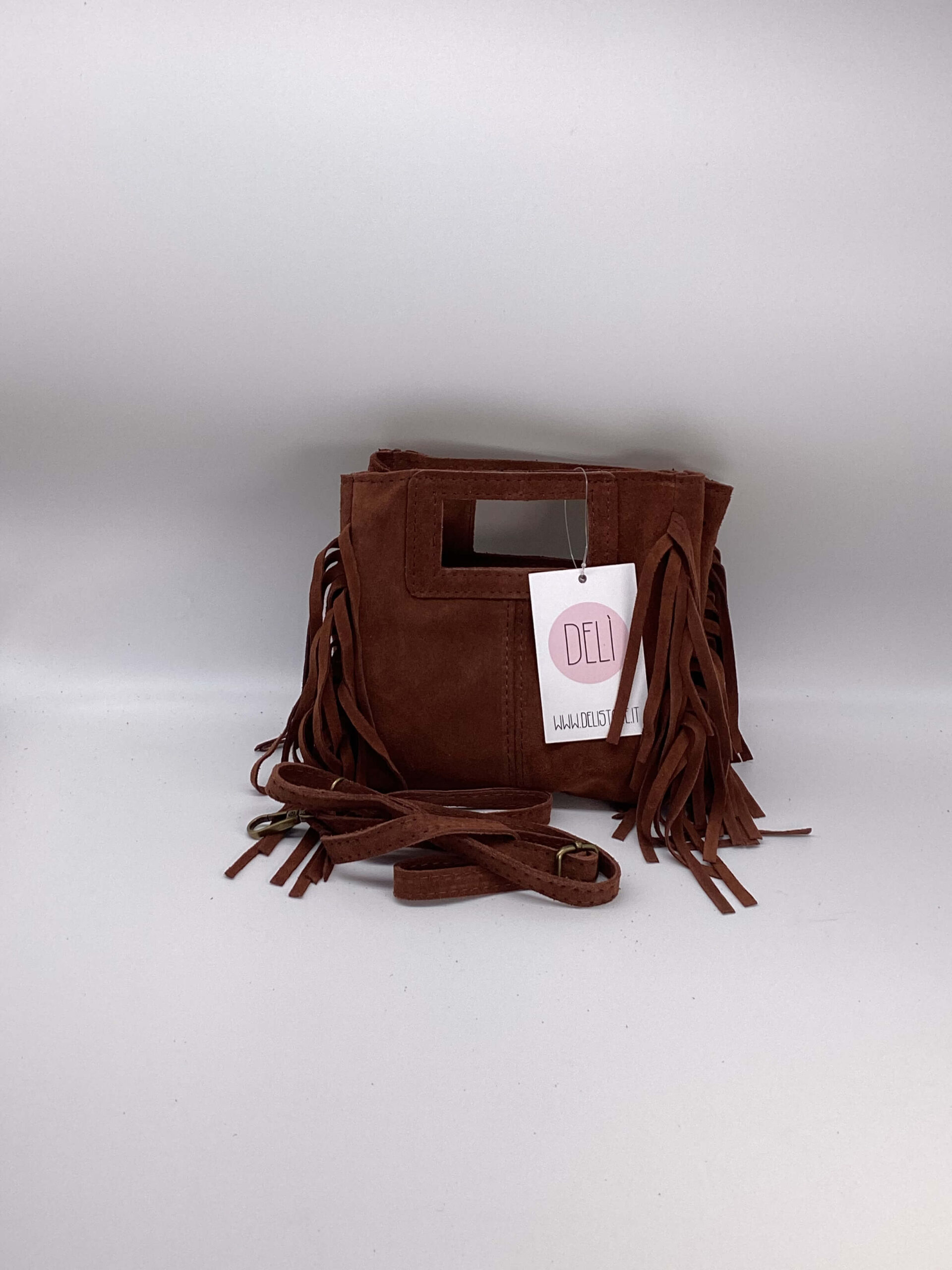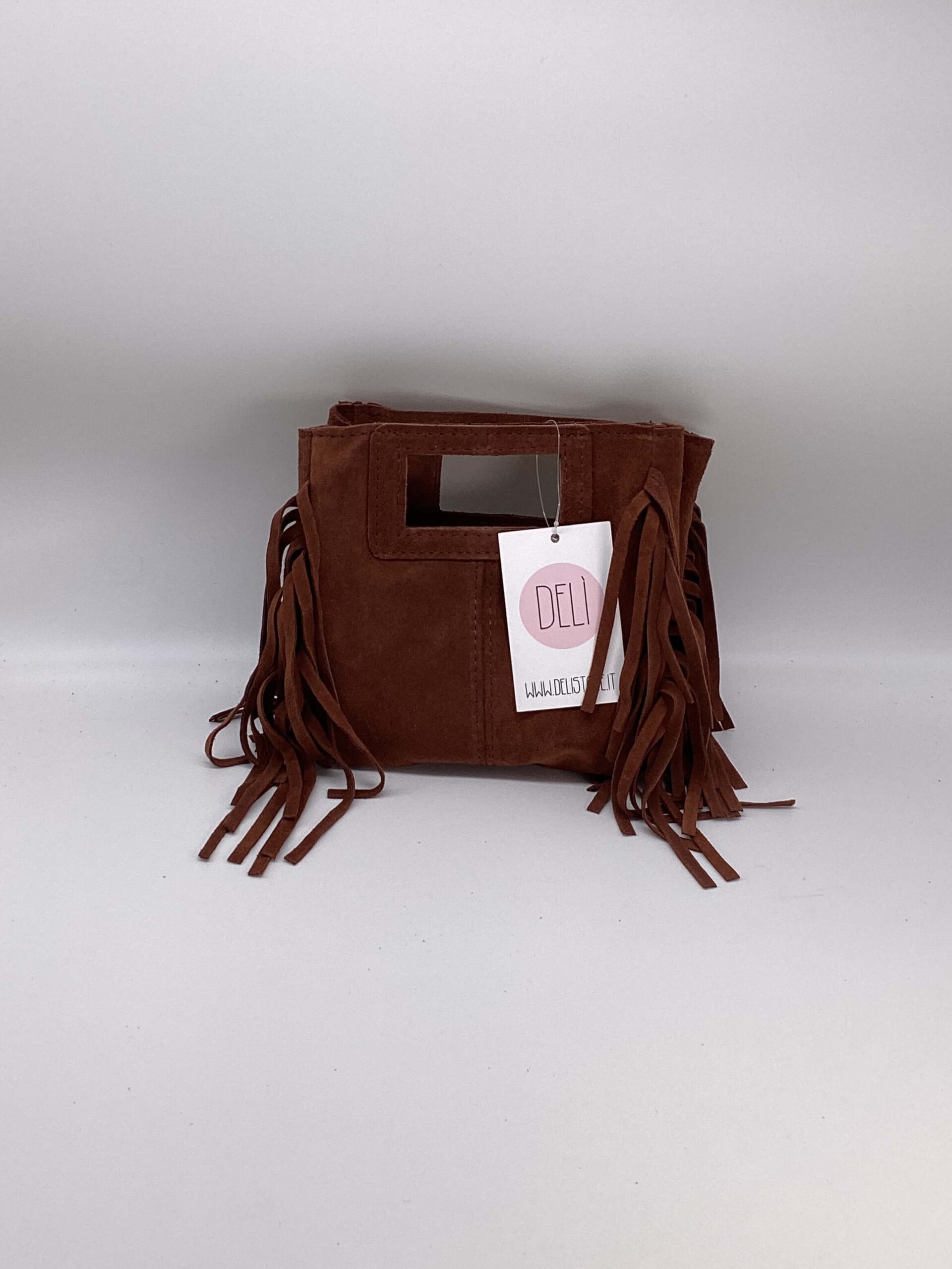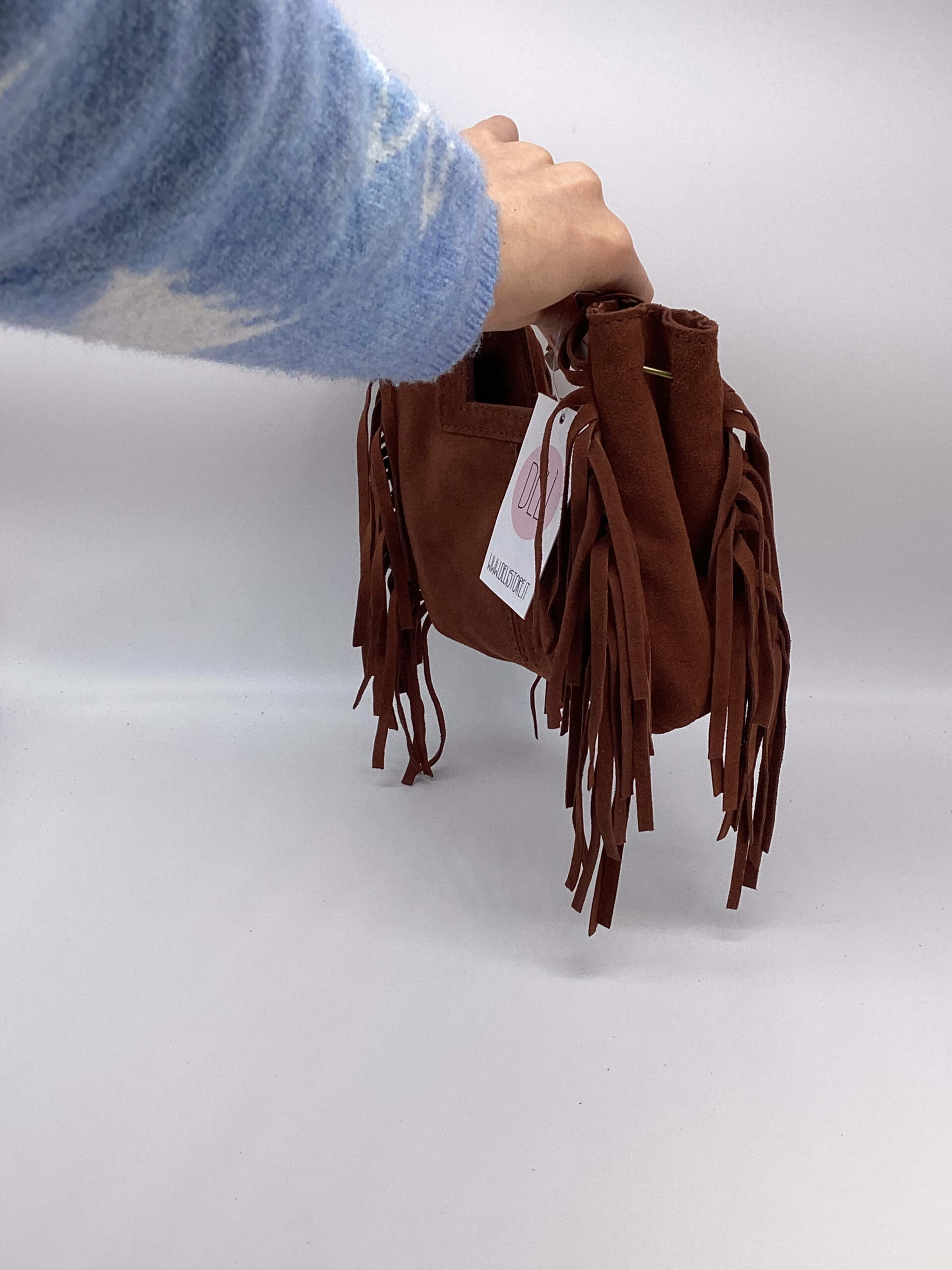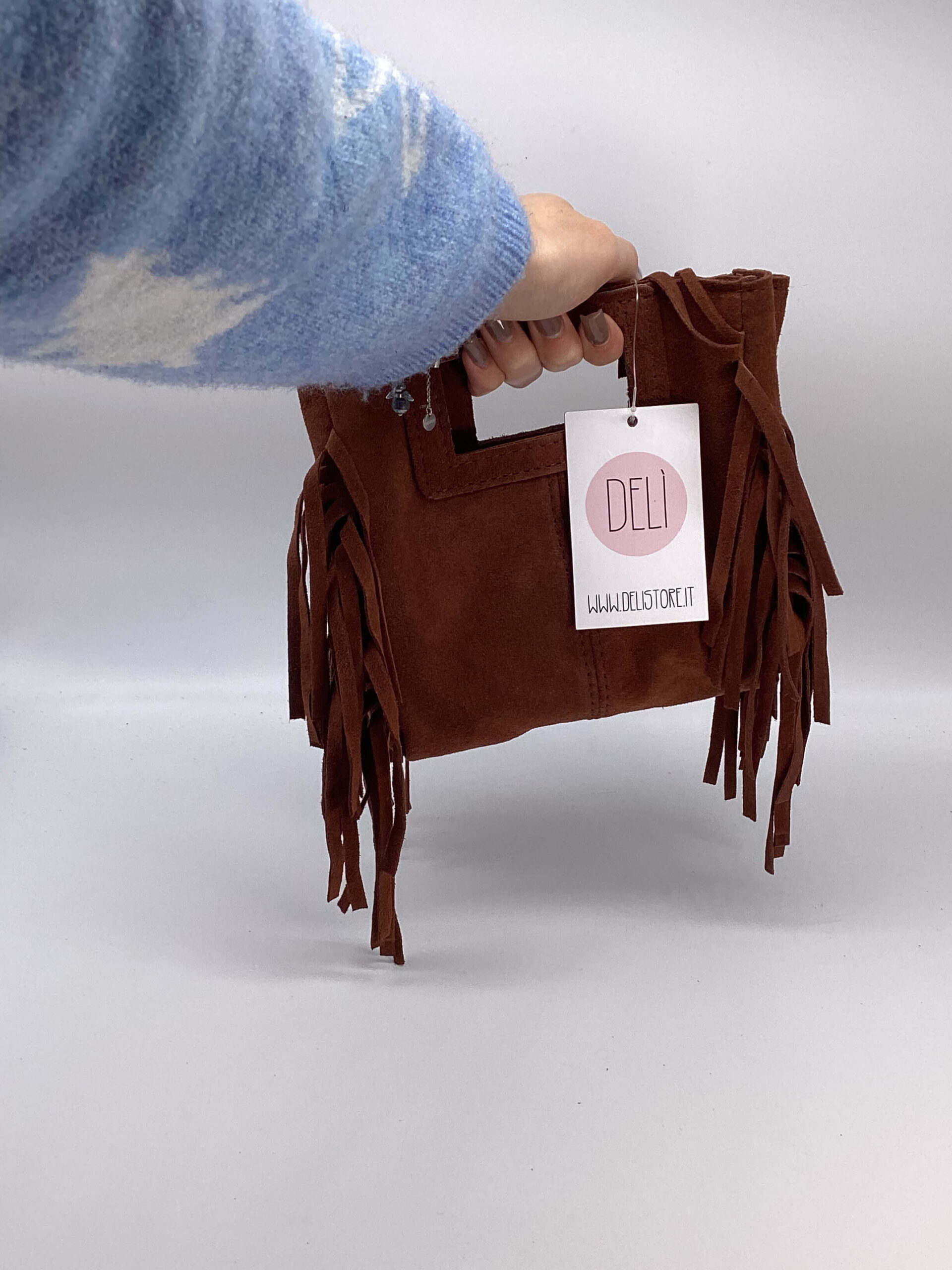 Borsa in pelle scamosciata, con frange, dettagli metallici color ottone anticato.