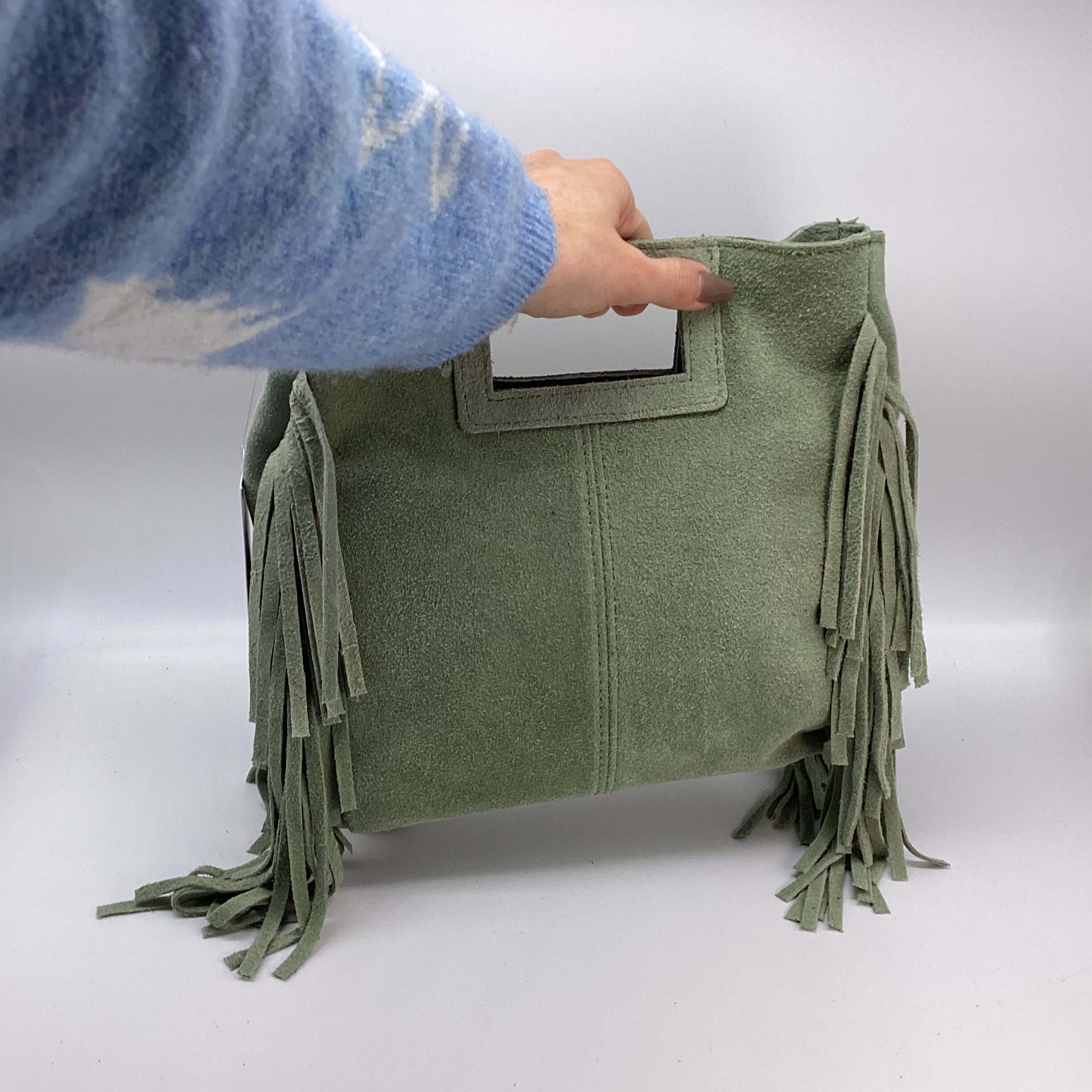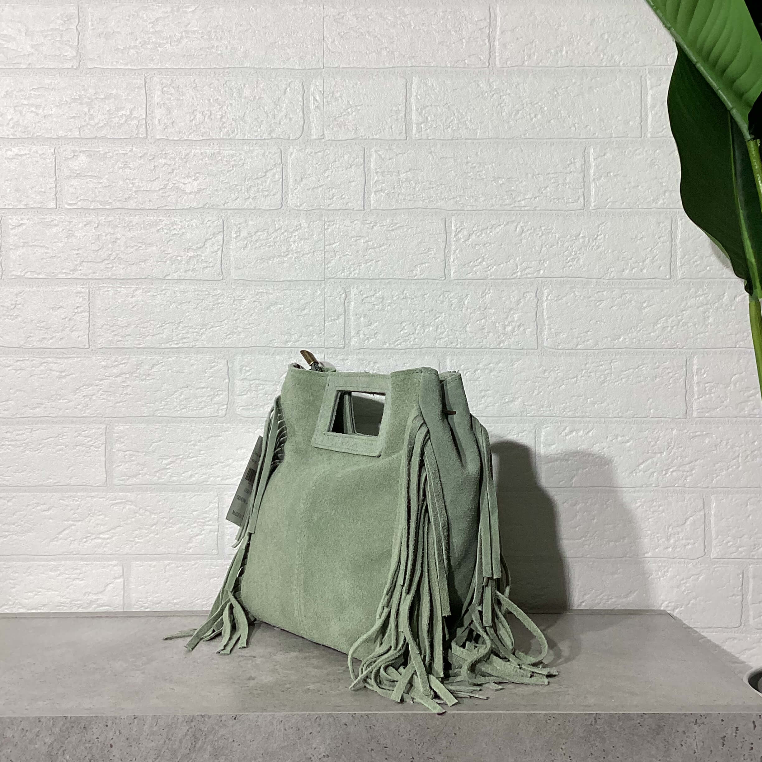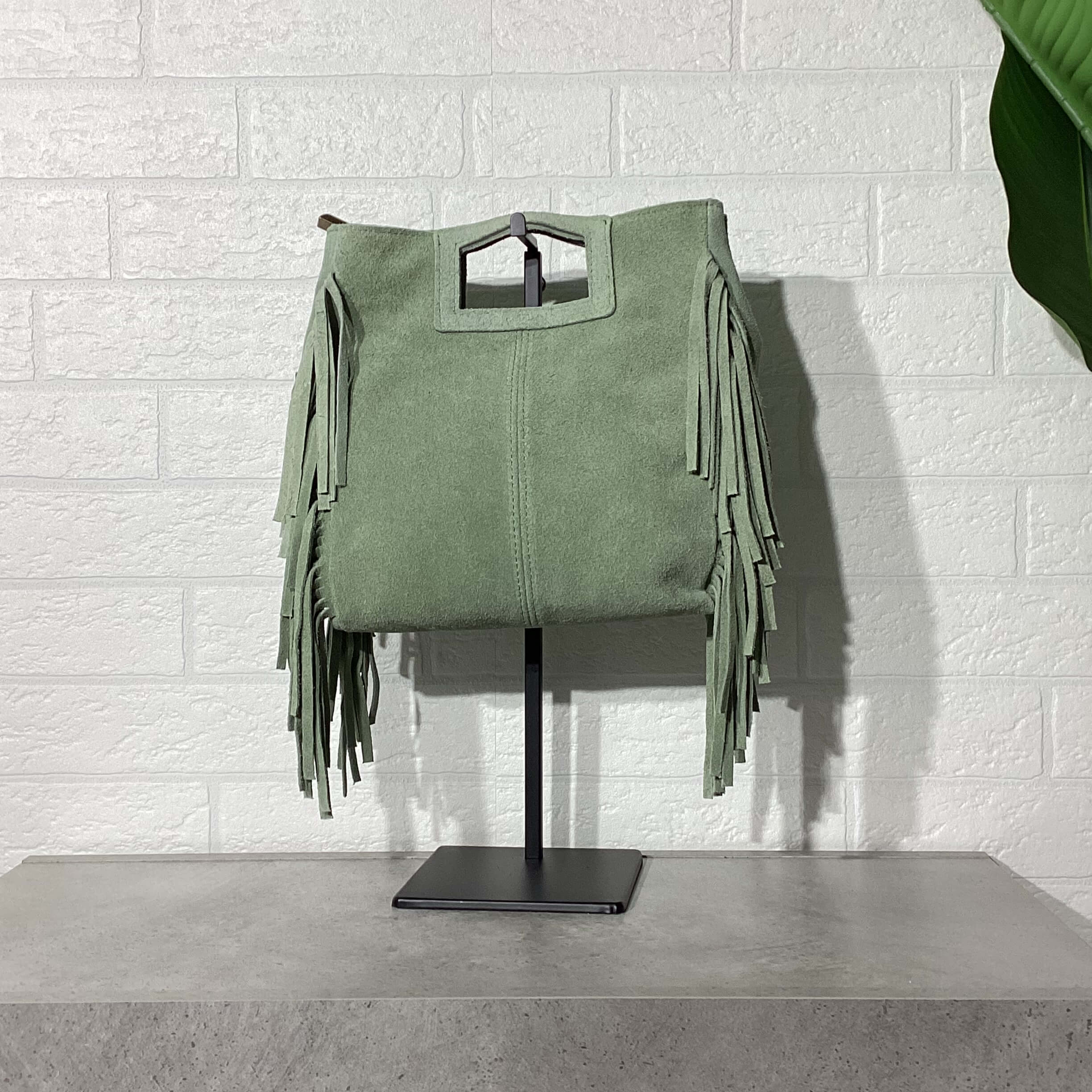 Borsa in pelle scamosciata, con frange, dettagli metallici color ottone anticato.