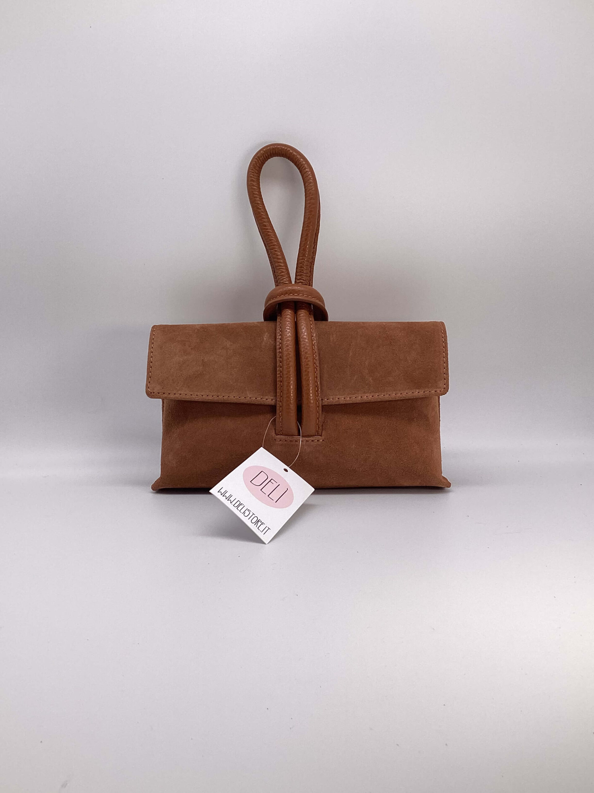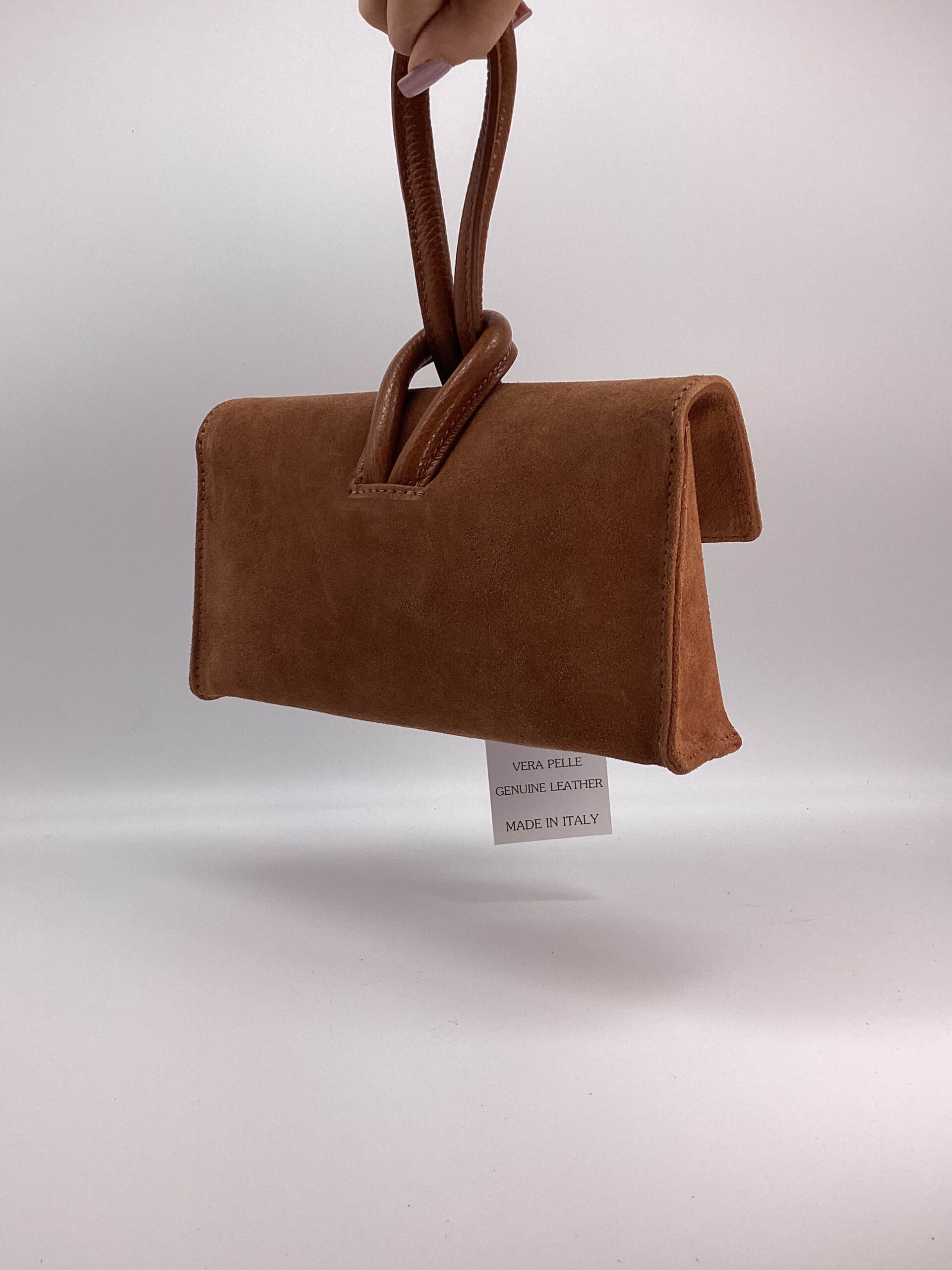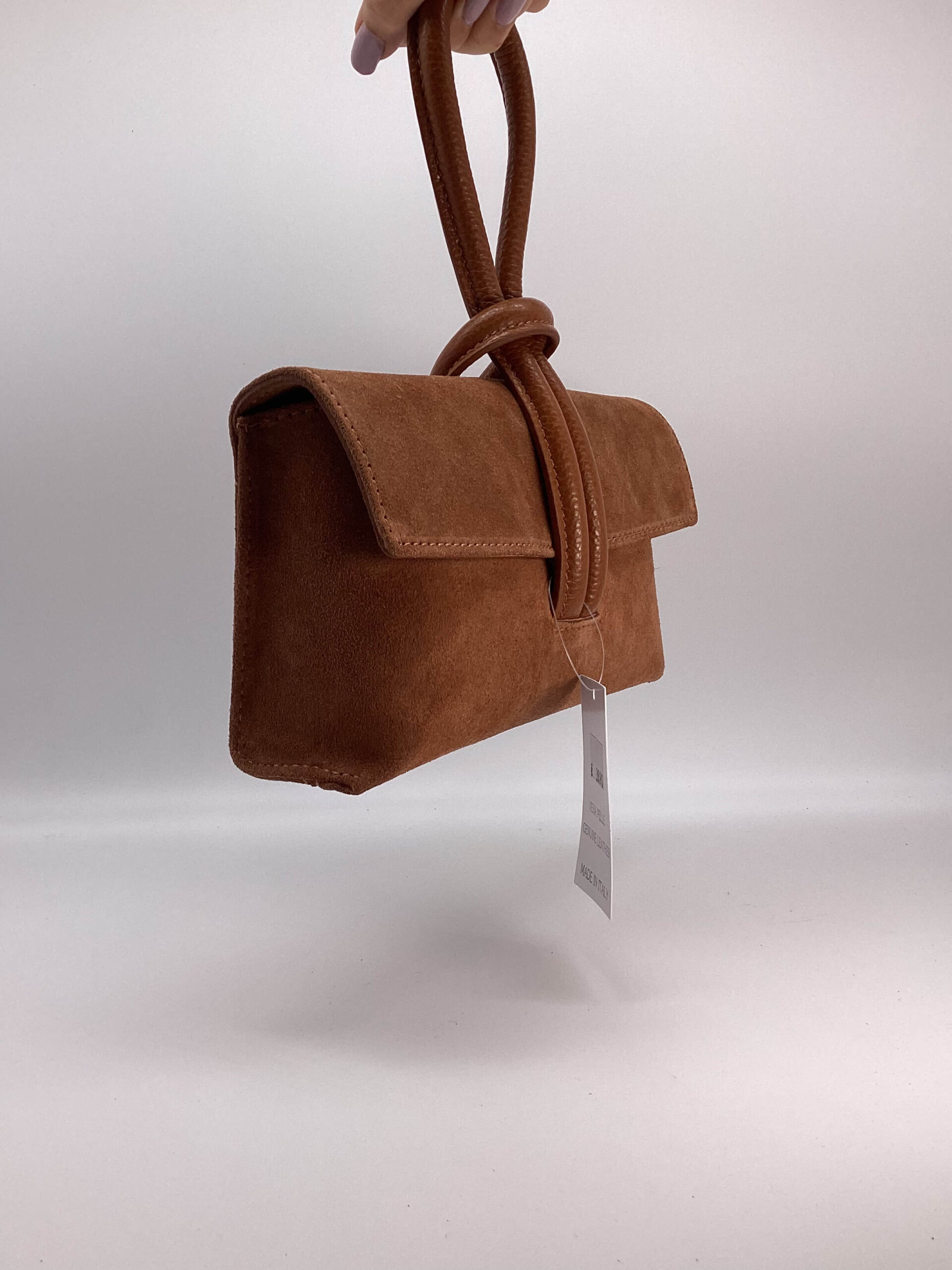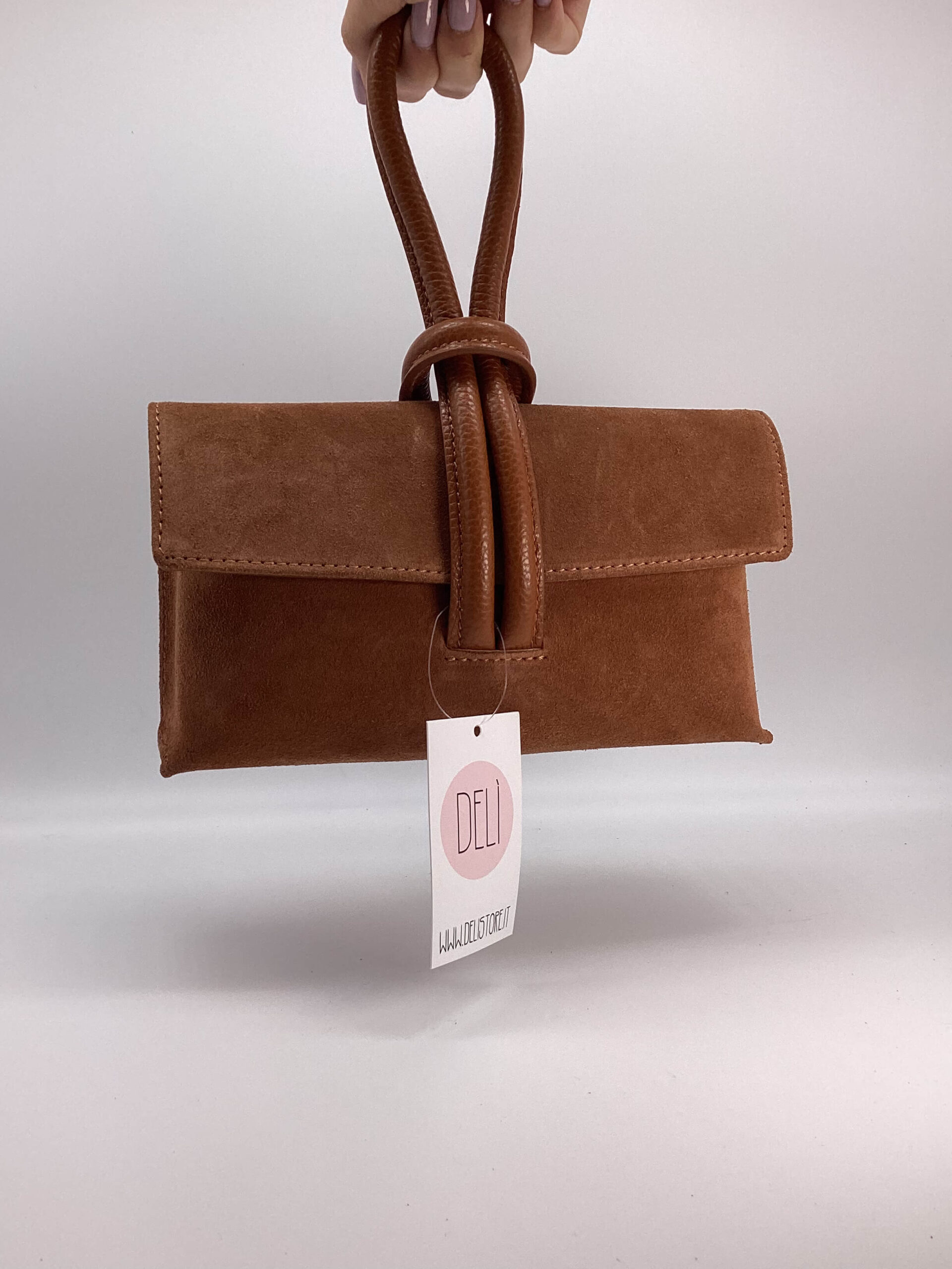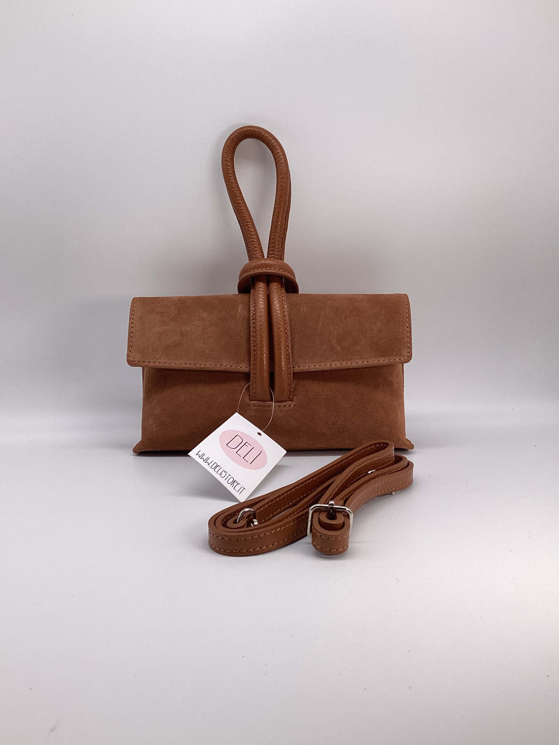 Borsa in camoscio, stile clutch, con manico a nodo e tracolla regolabile inclusa.