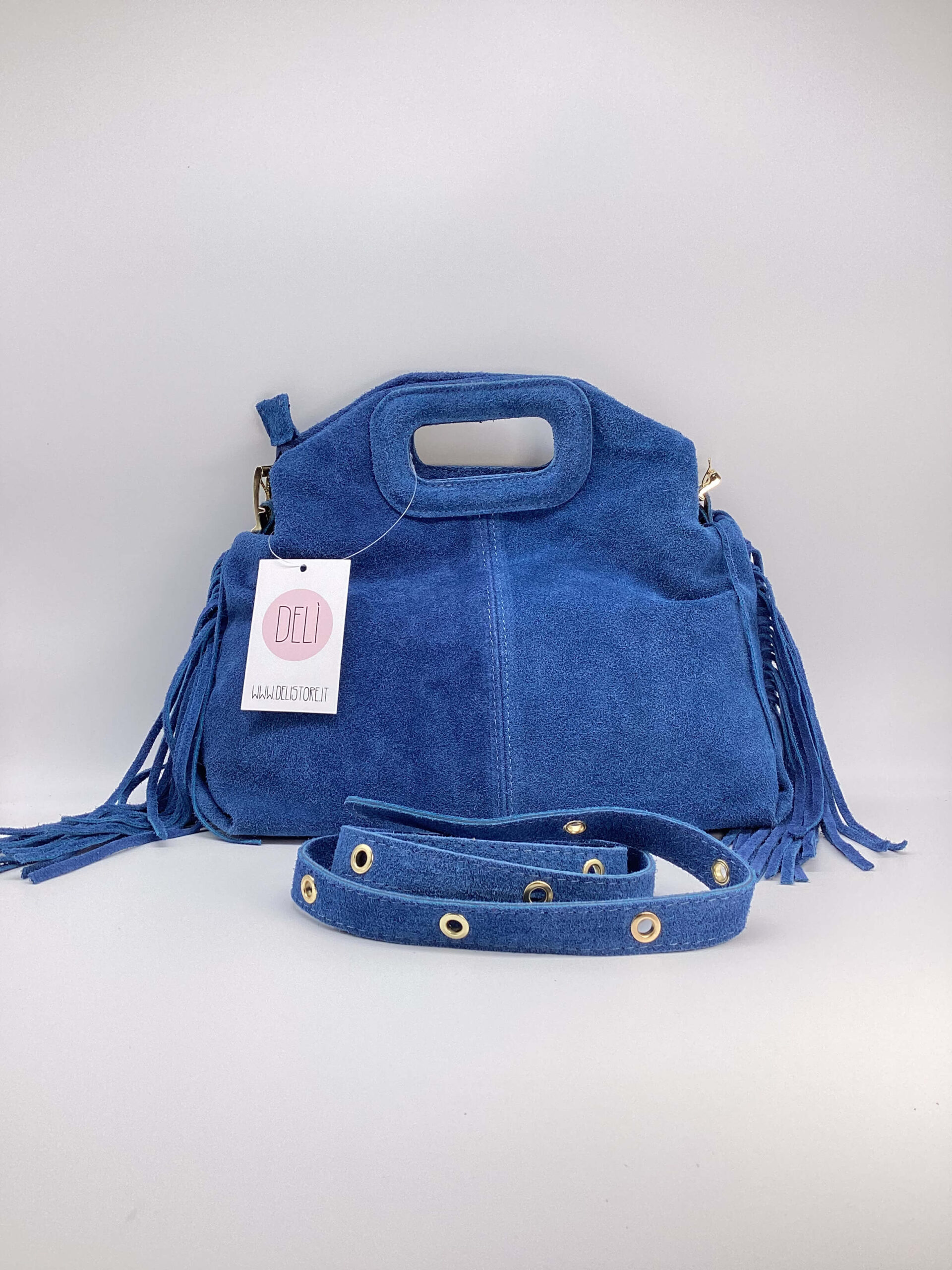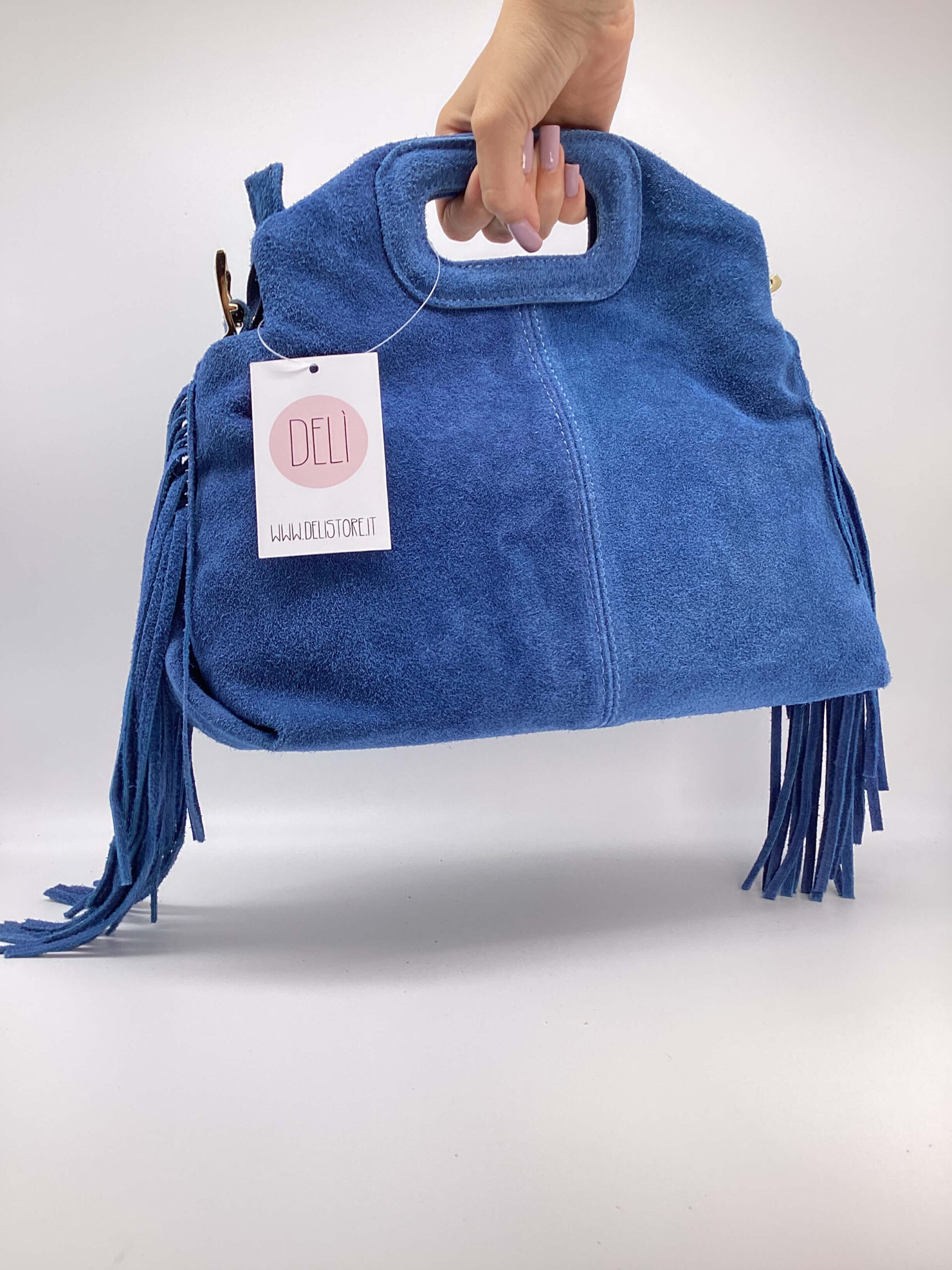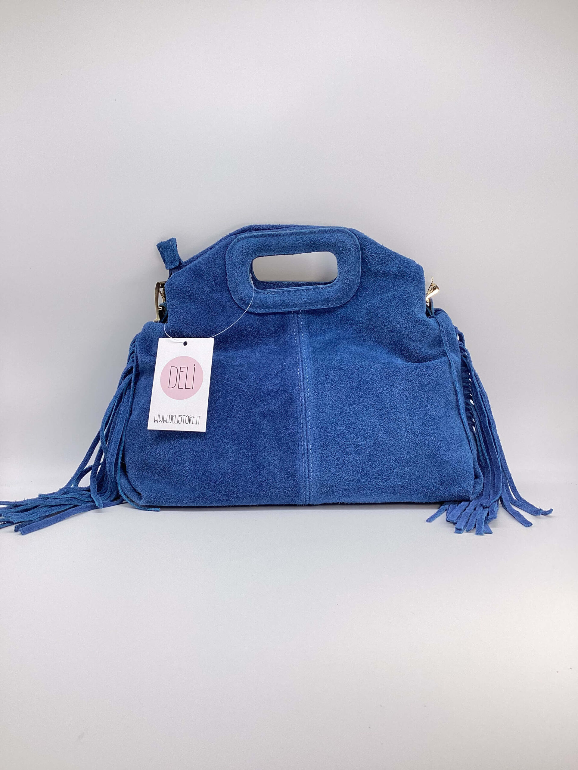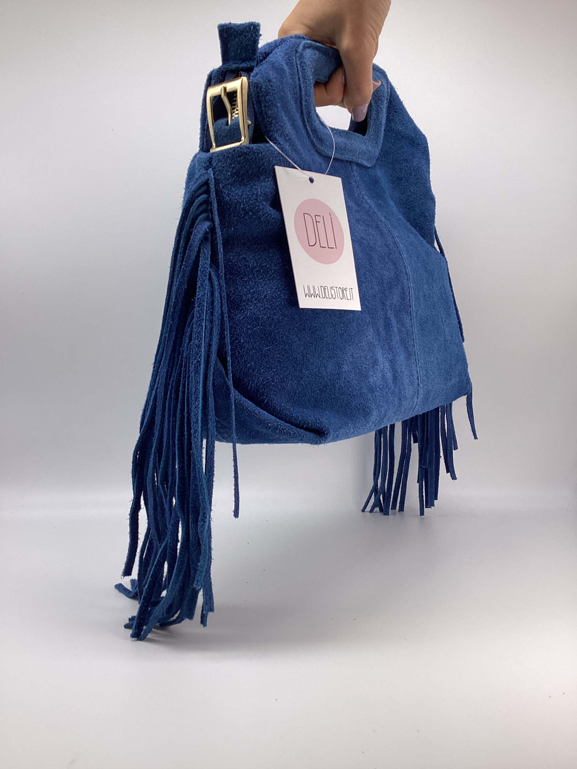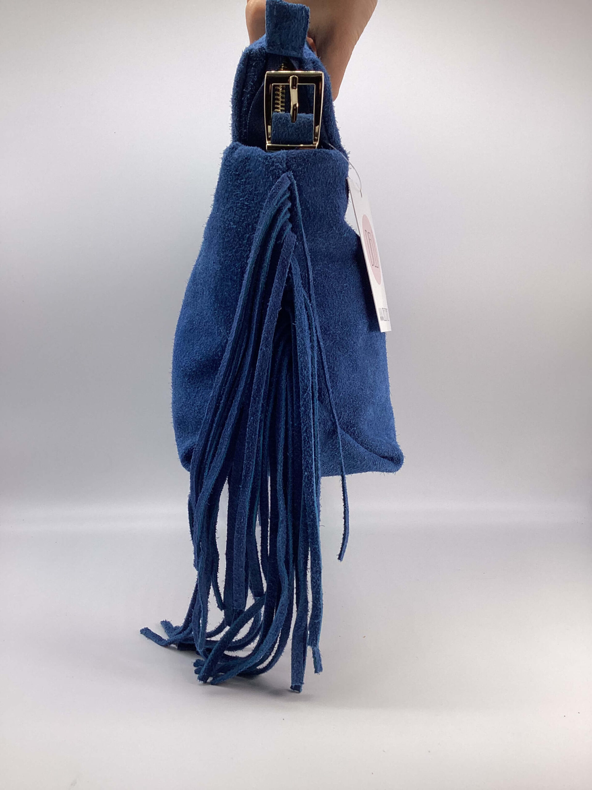 Borsa in pelle scamosciata, con frange, dettagli metallici color oro.
