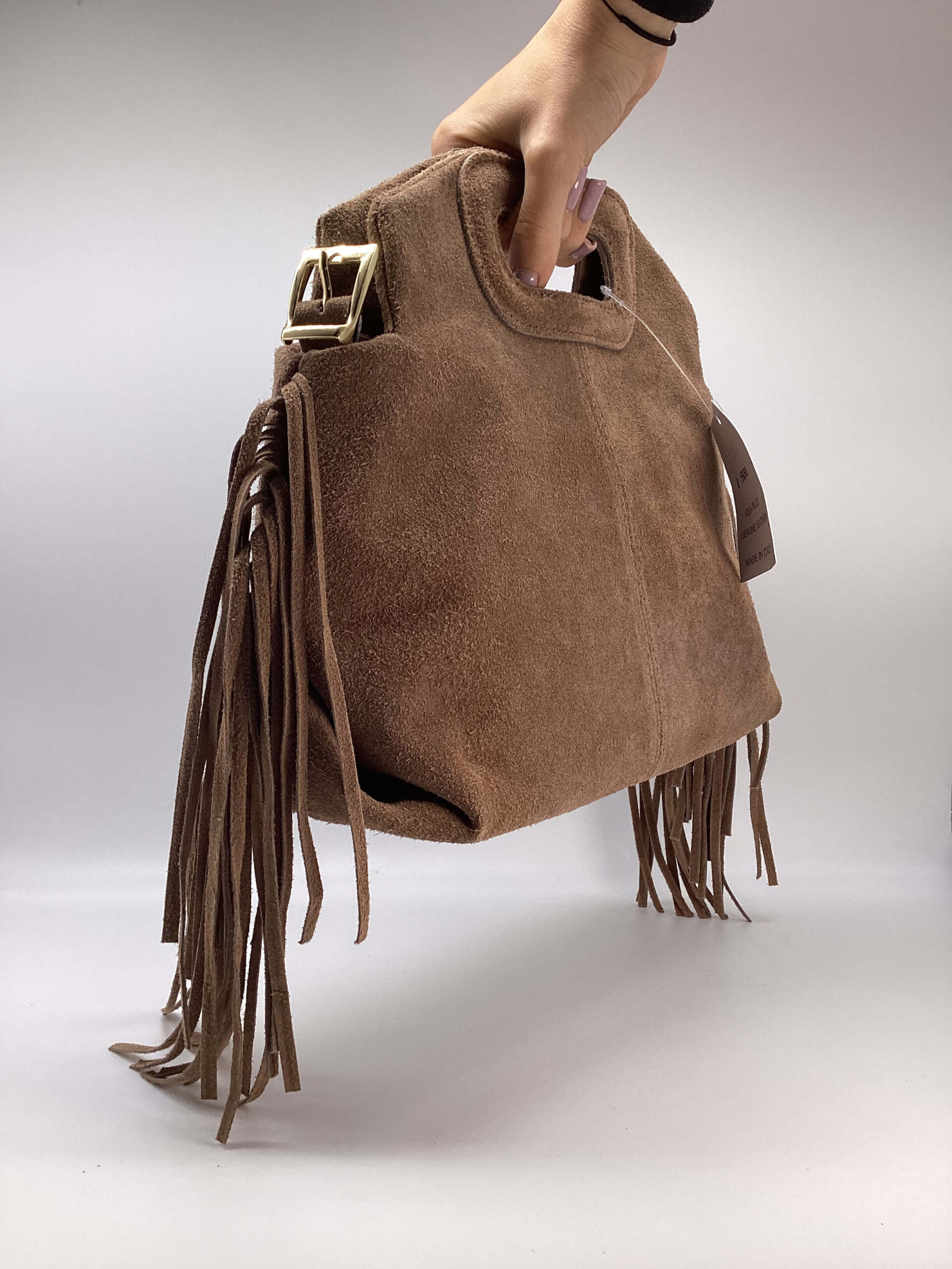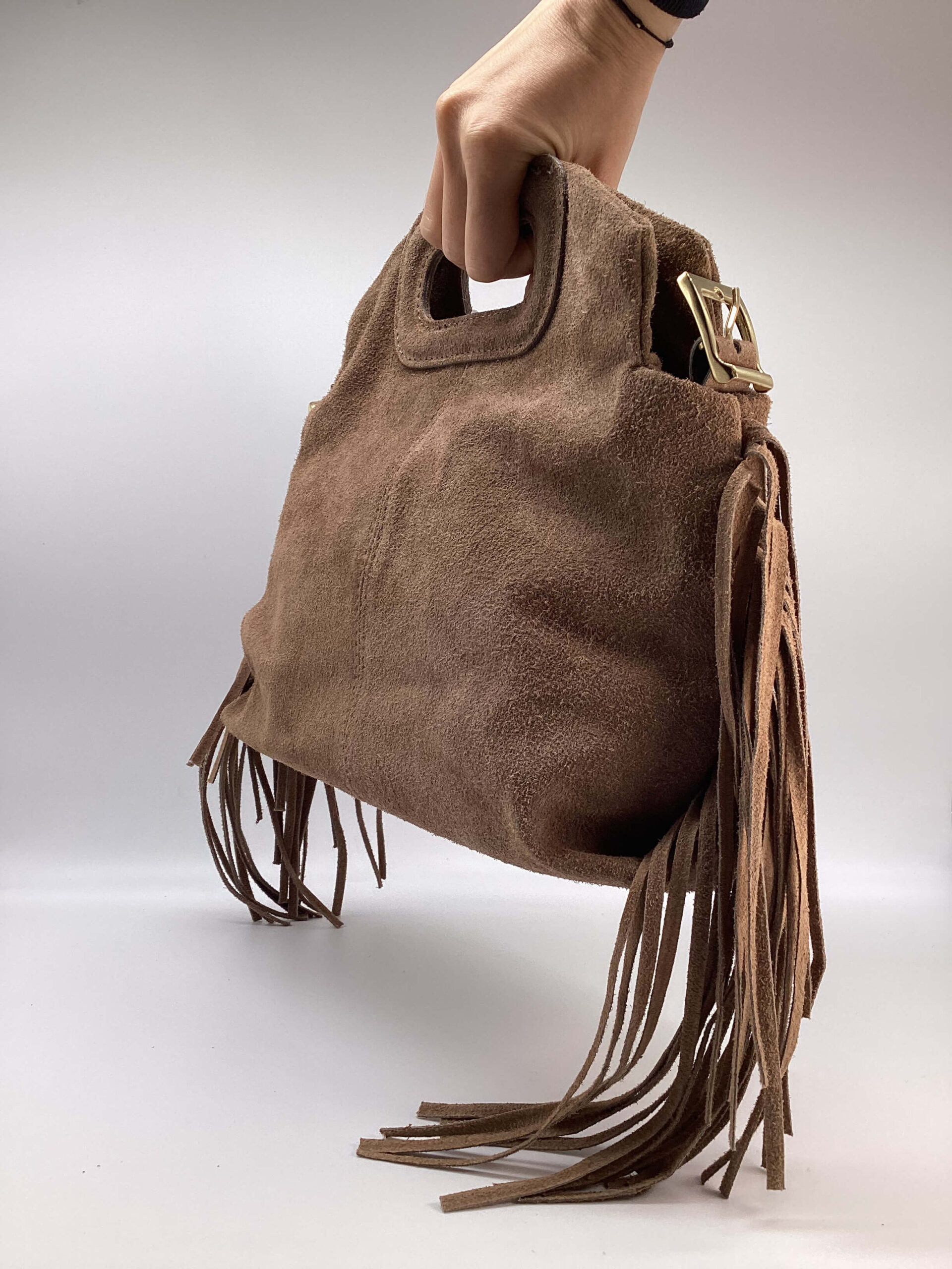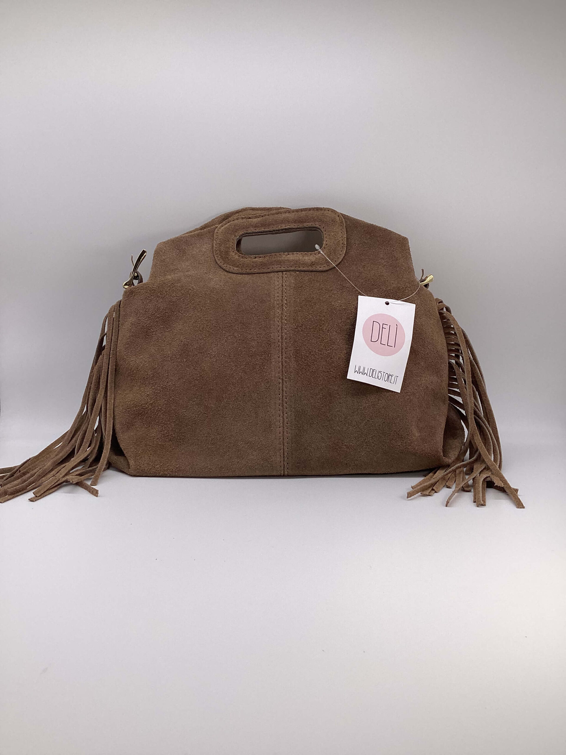 Borsa in pelle scamosciata, con frange, dettagli metallici color oro.