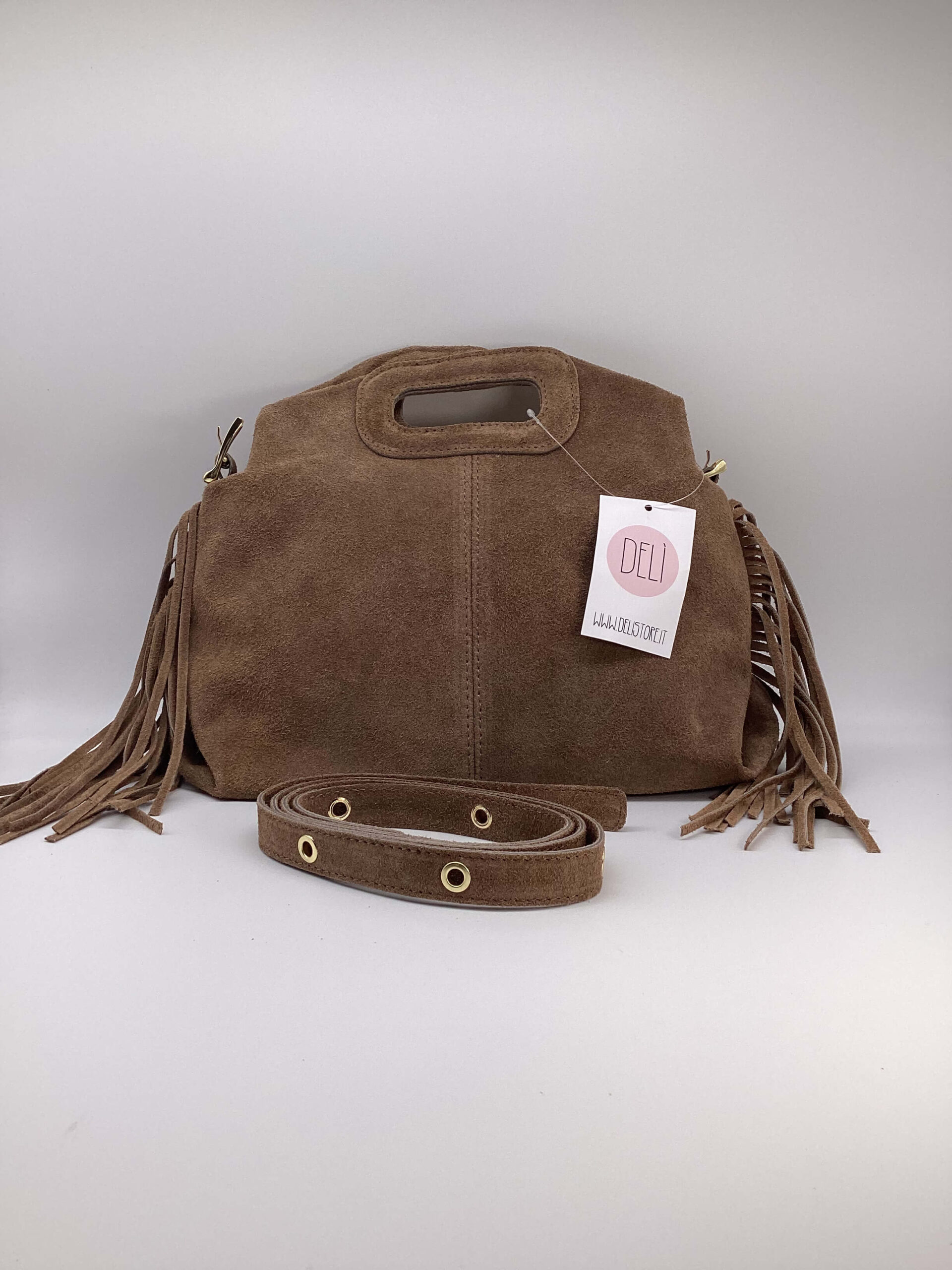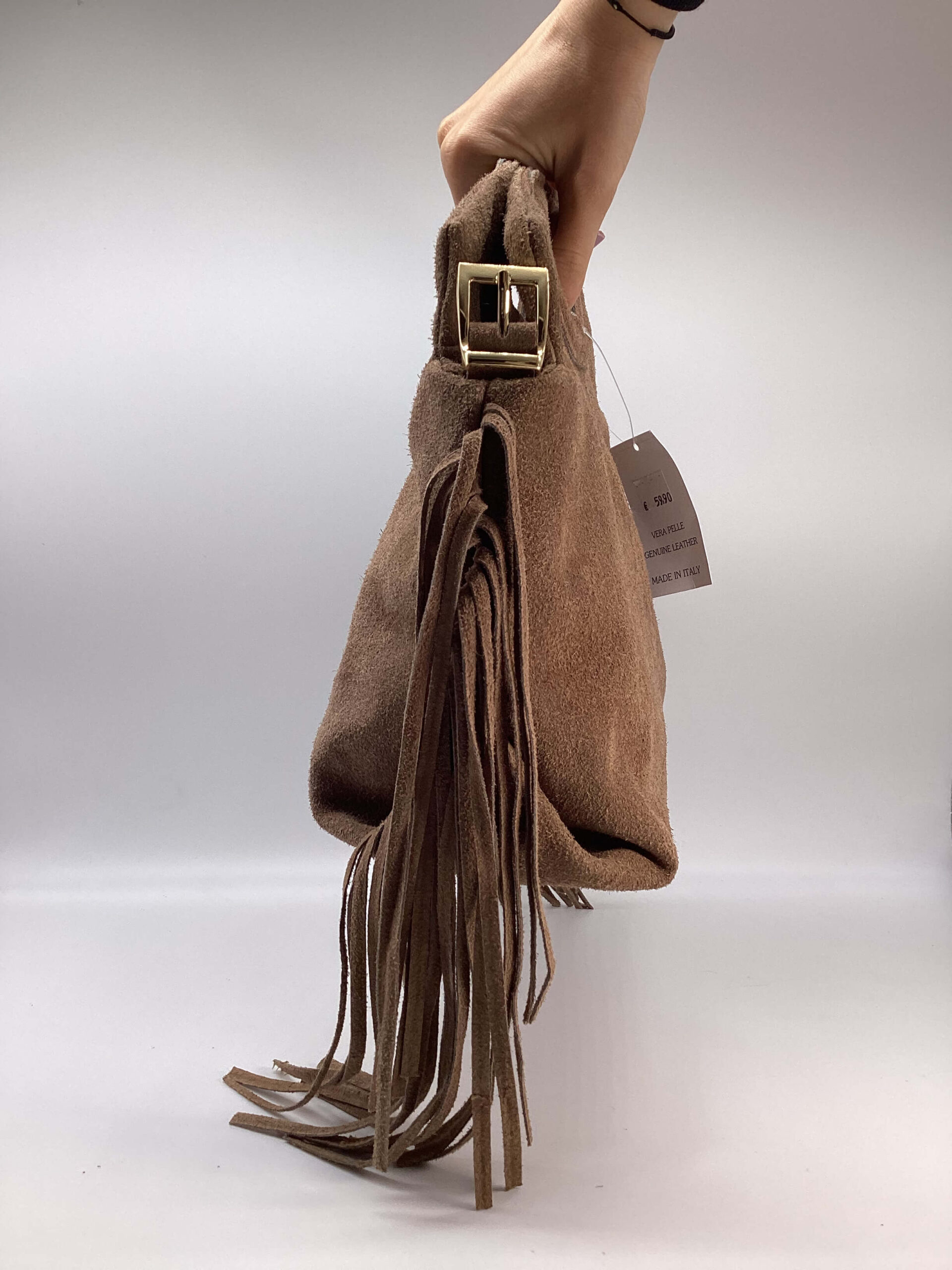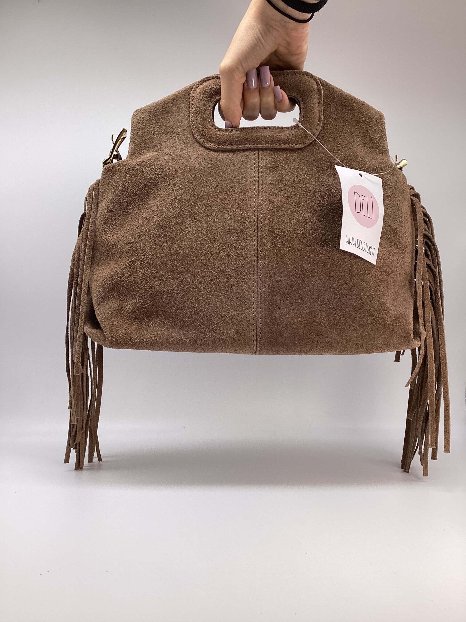 Borsa in pelle scamosciata, con frange, dettagli metallici color oro.