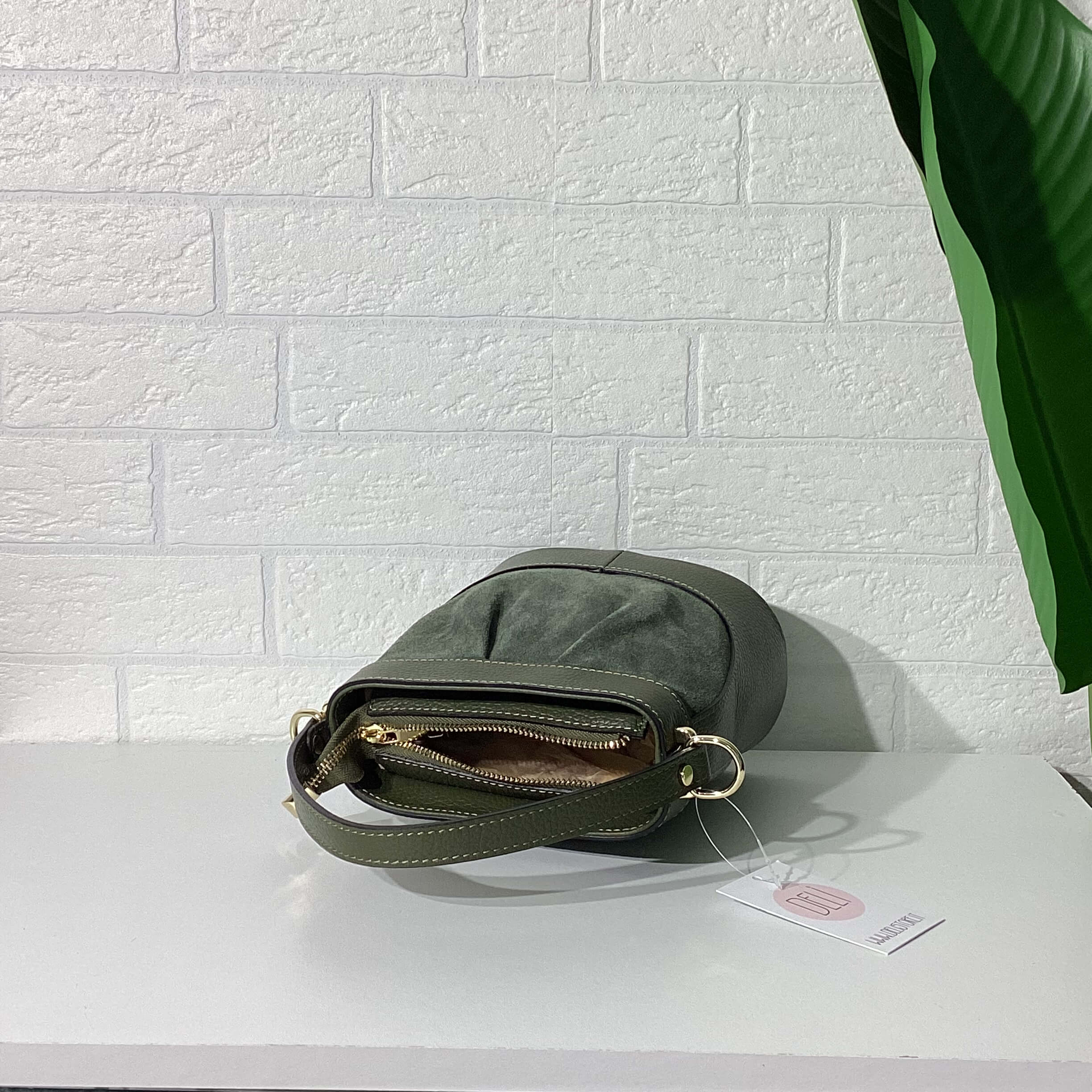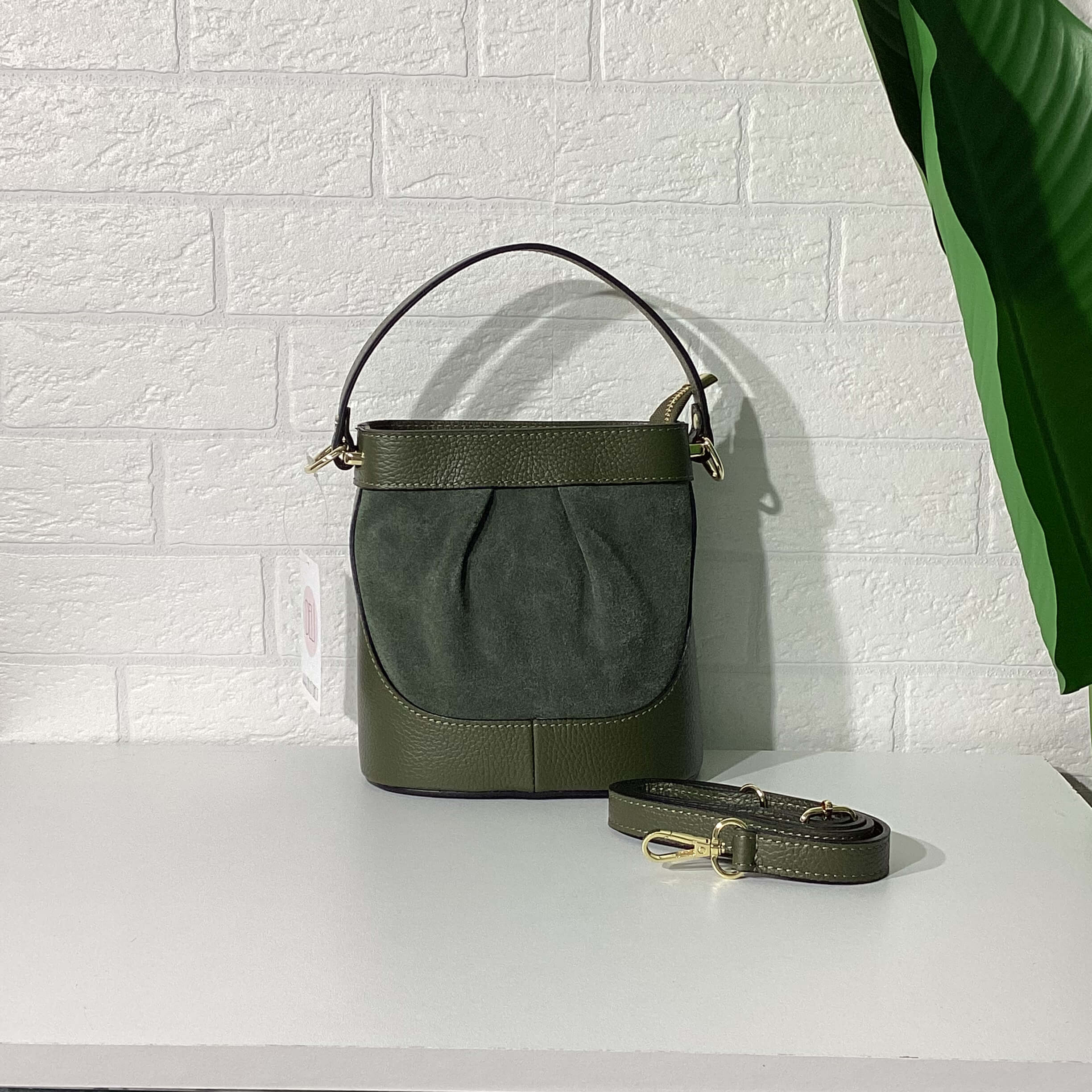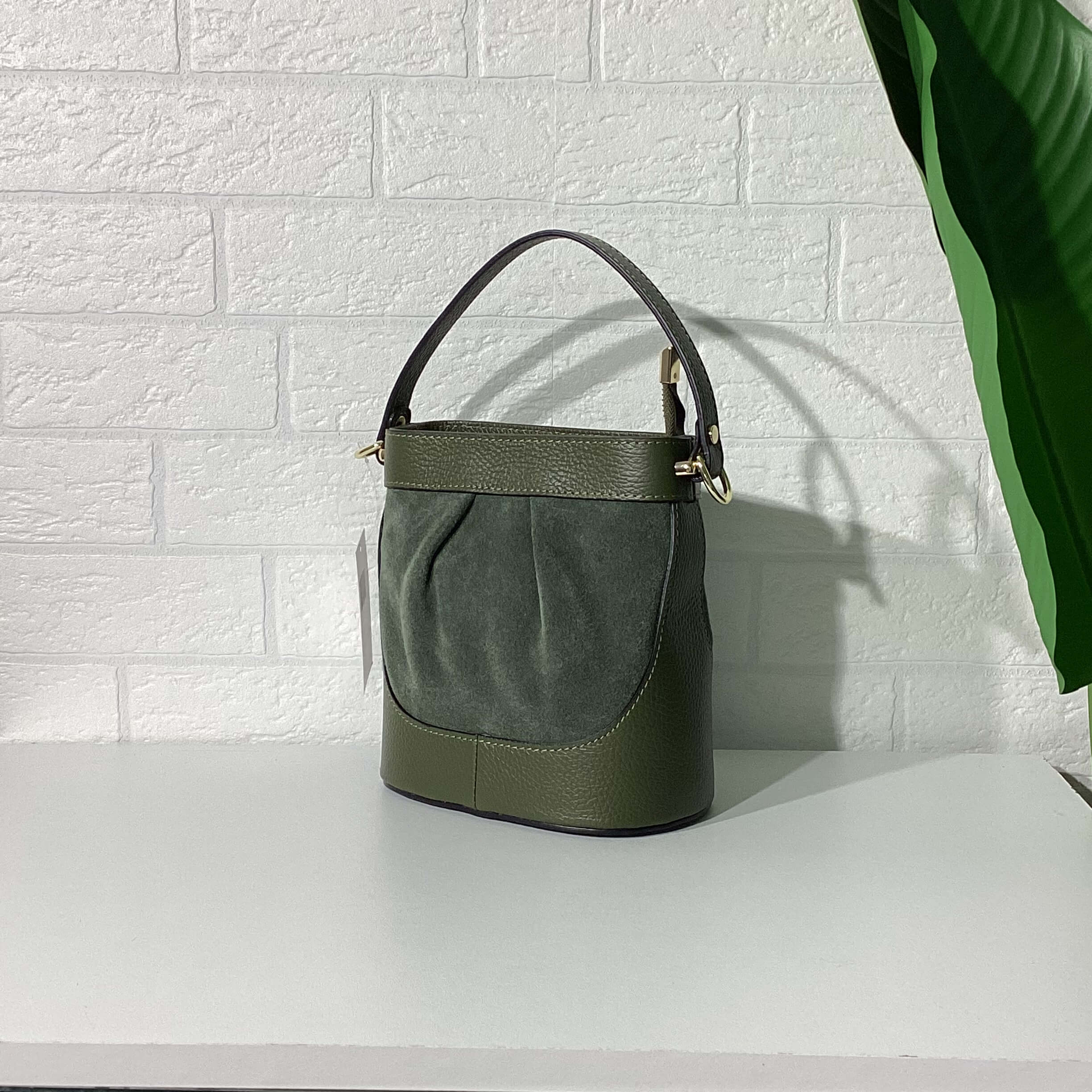 Borsa in pelle e pelle scamosciata, dettagli metallici color oro.