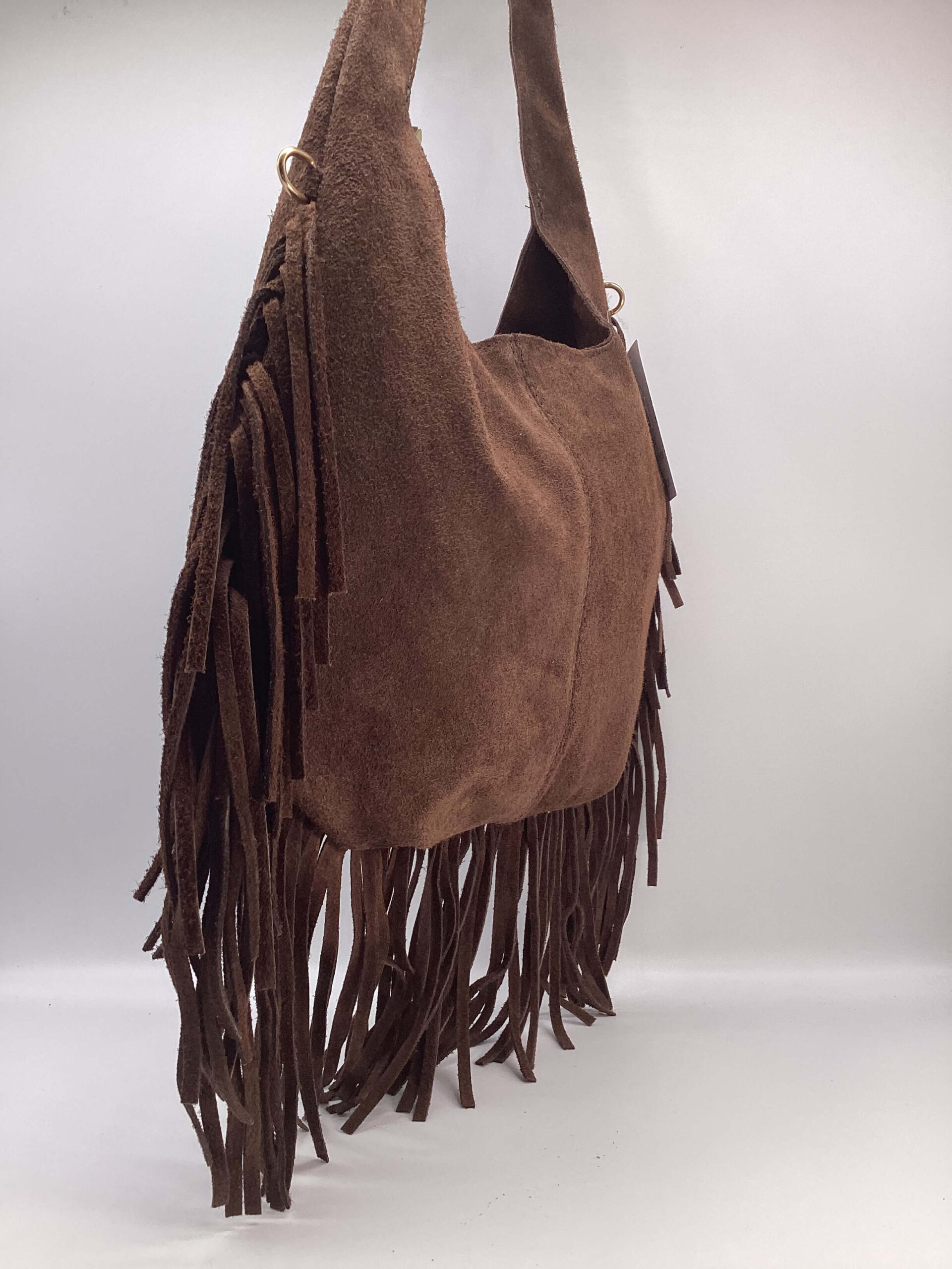Borsa in pelle scamosciata, con frange, dettagli metallici color oro.