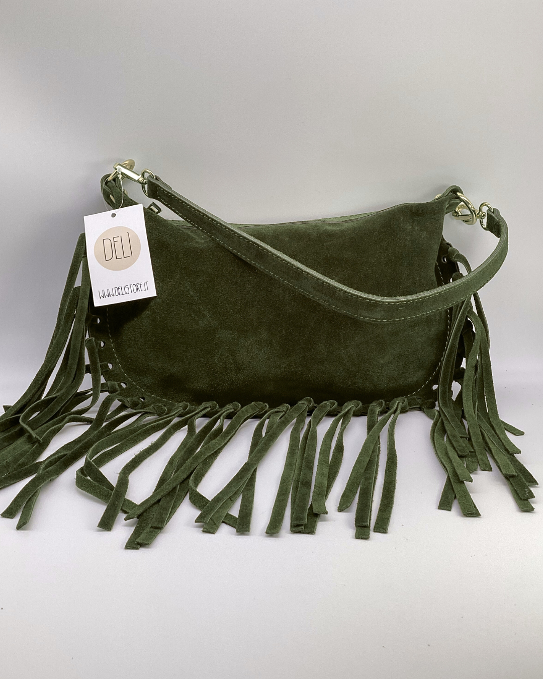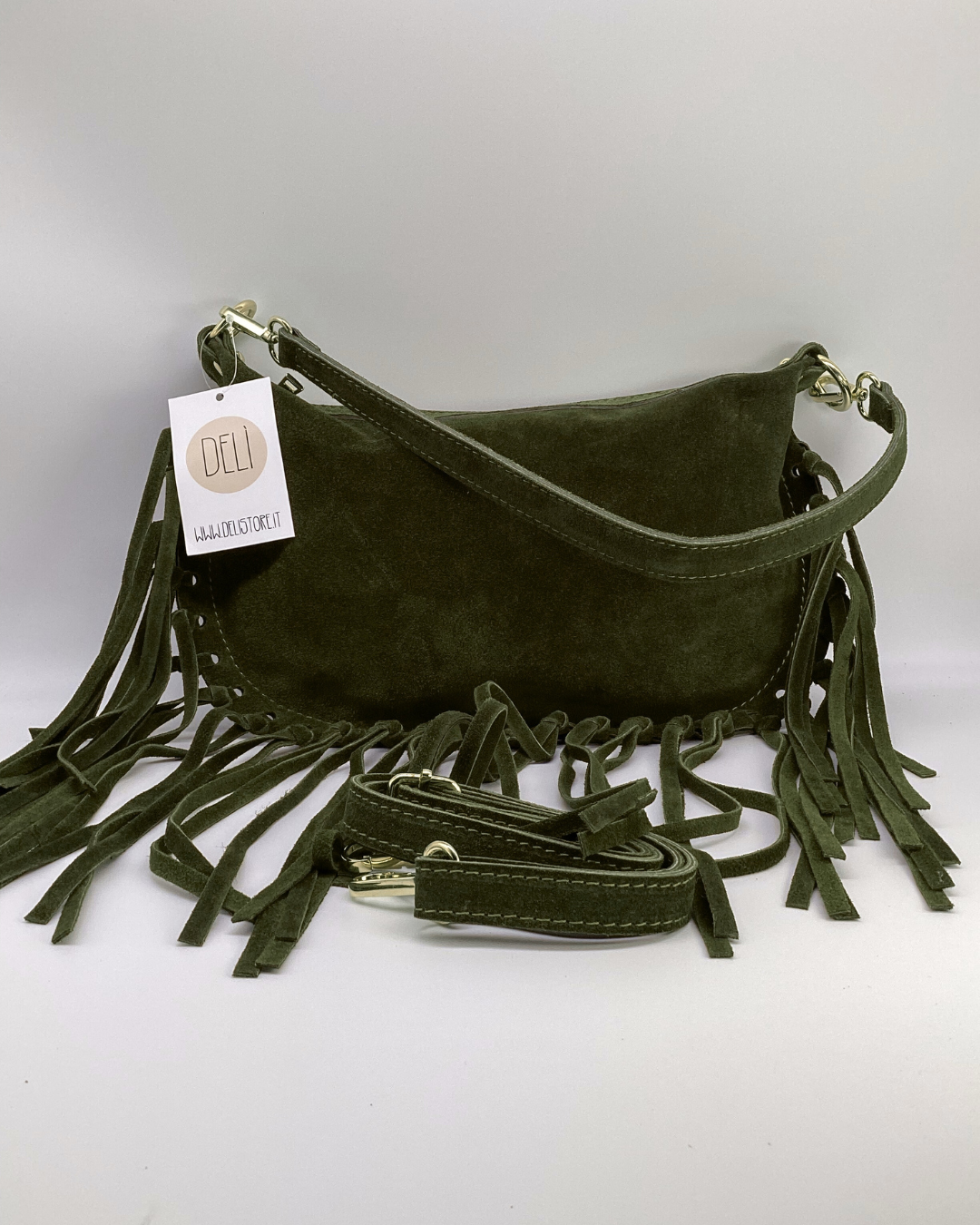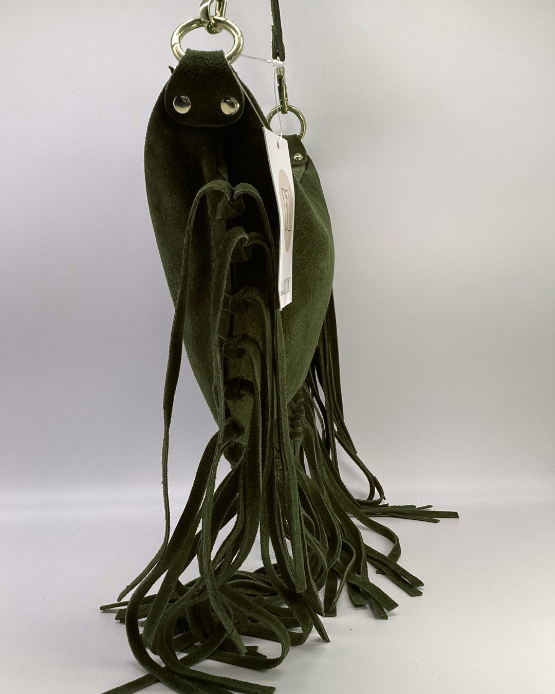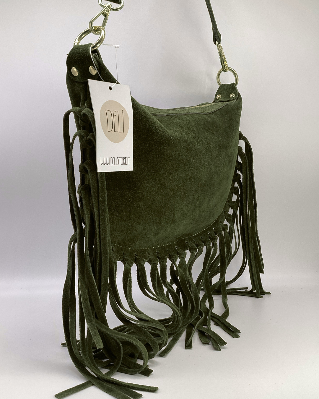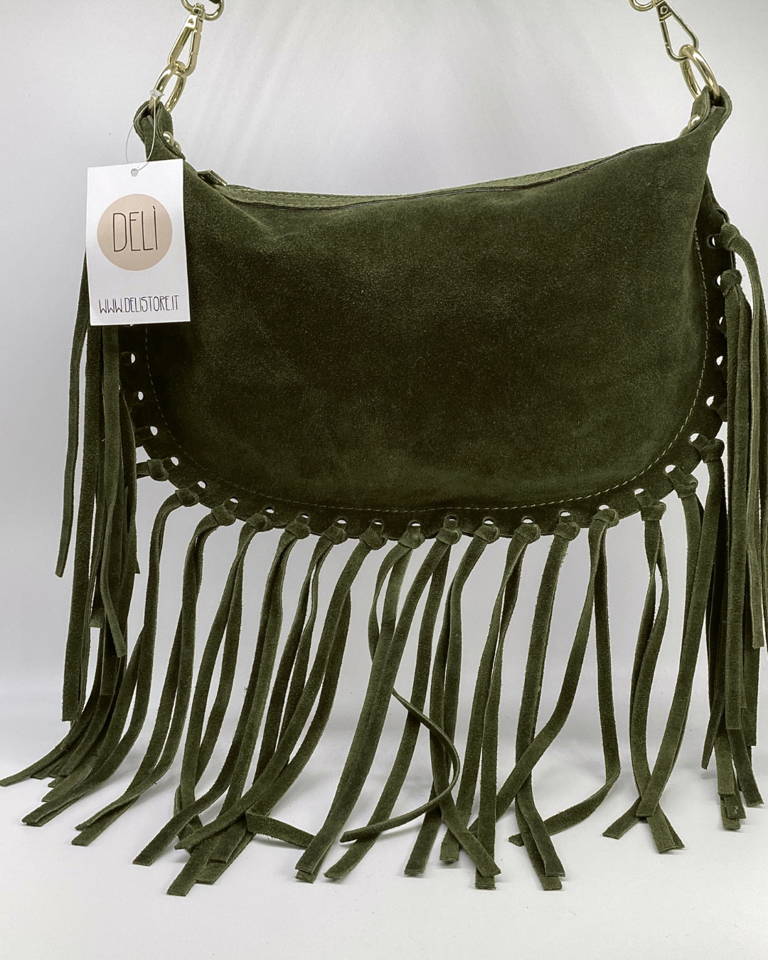 Borsa in pelle scamosciata, con frange, dettagli metallici color oro.
