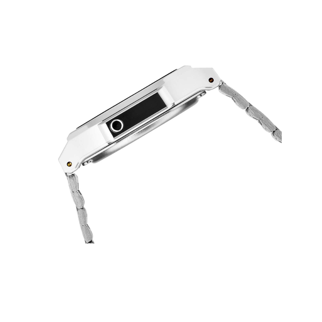 • cassa in resina e bracciale in acciaio inox con chiusura regolabile, resistente all’acqua