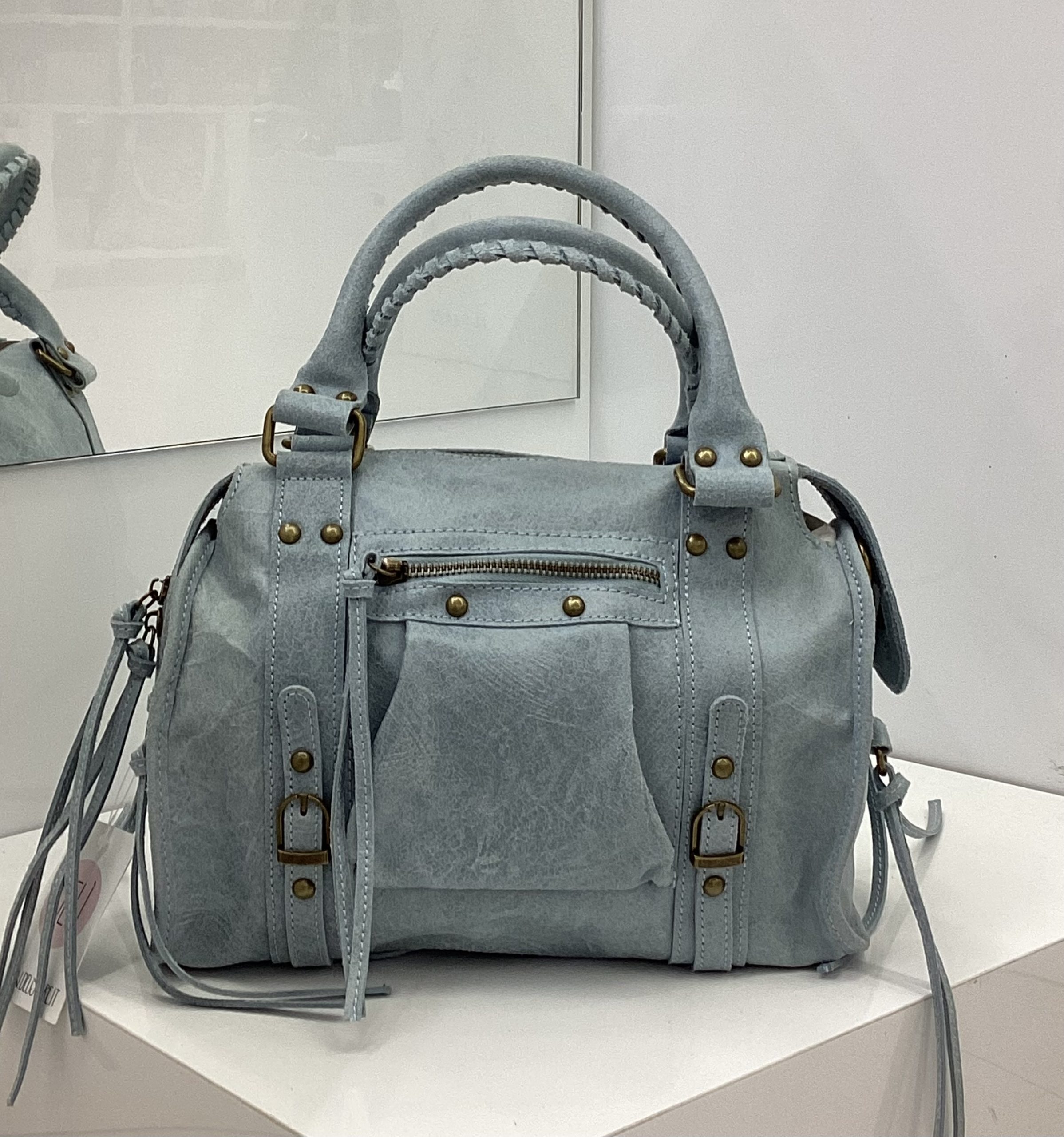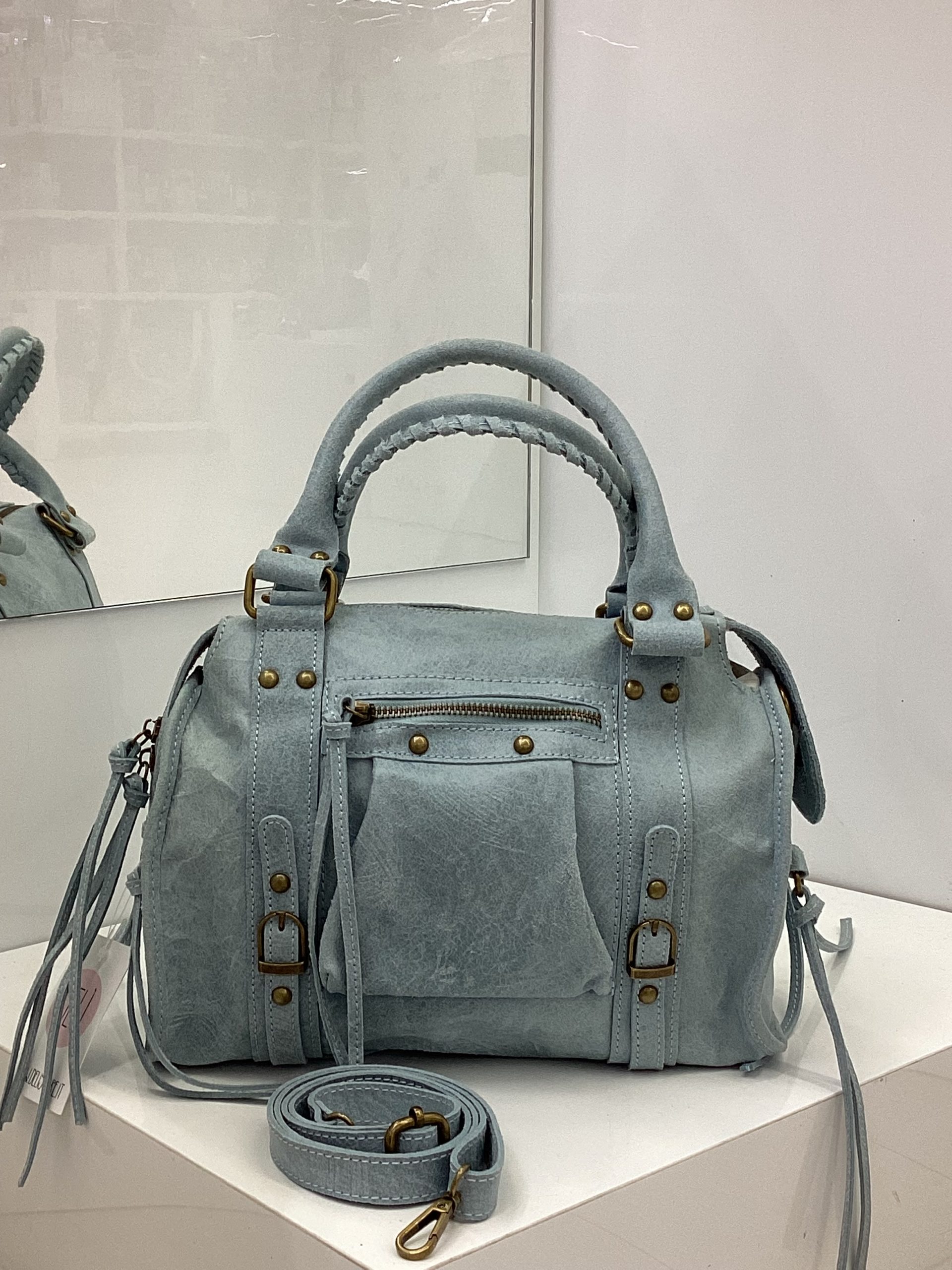 Borsa in vera pelle con due manici e tracolla regolabile.