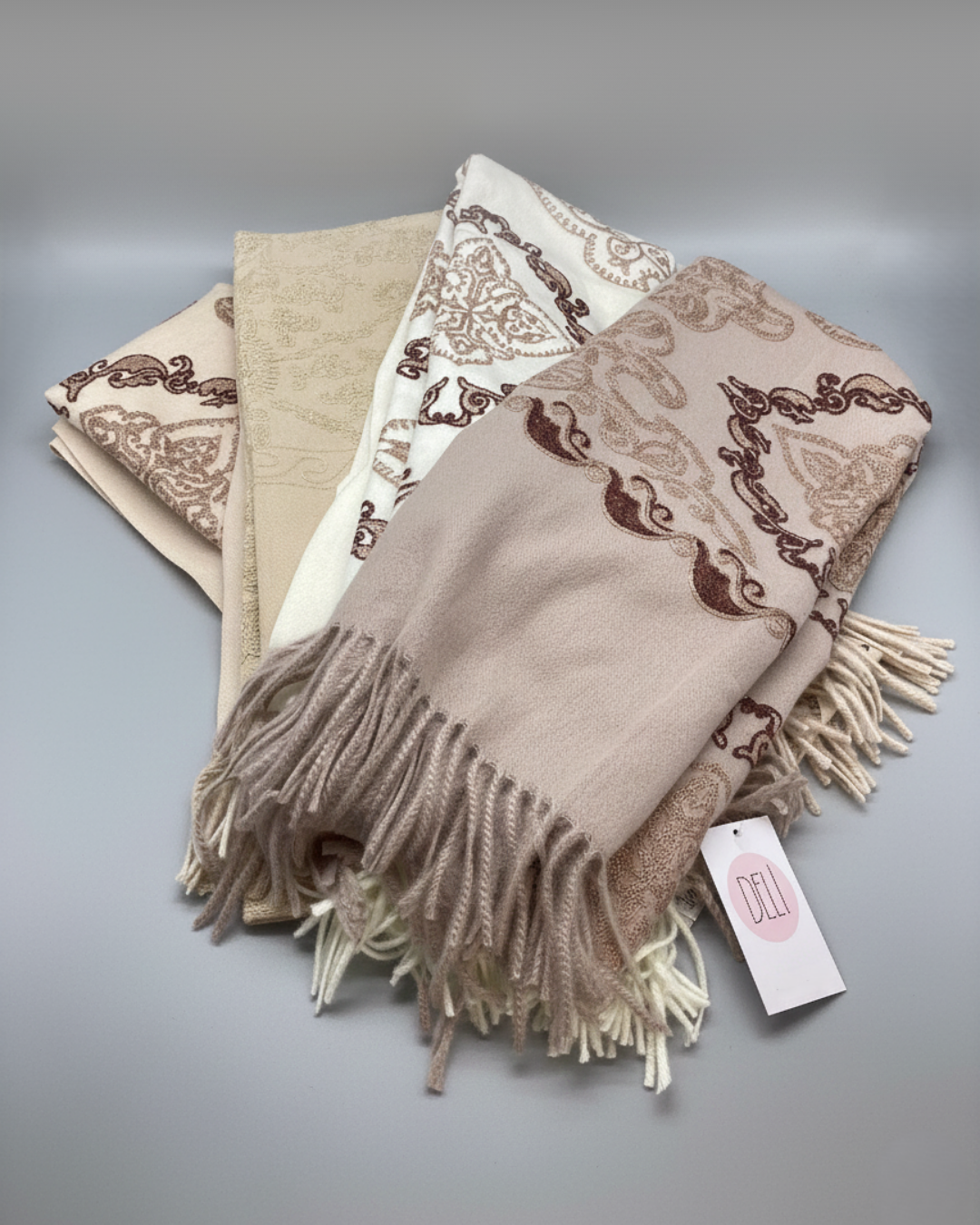 Sciarpa morbida con ricami e frange, tessuto soffice al tatto per il massimo comfort e calore.