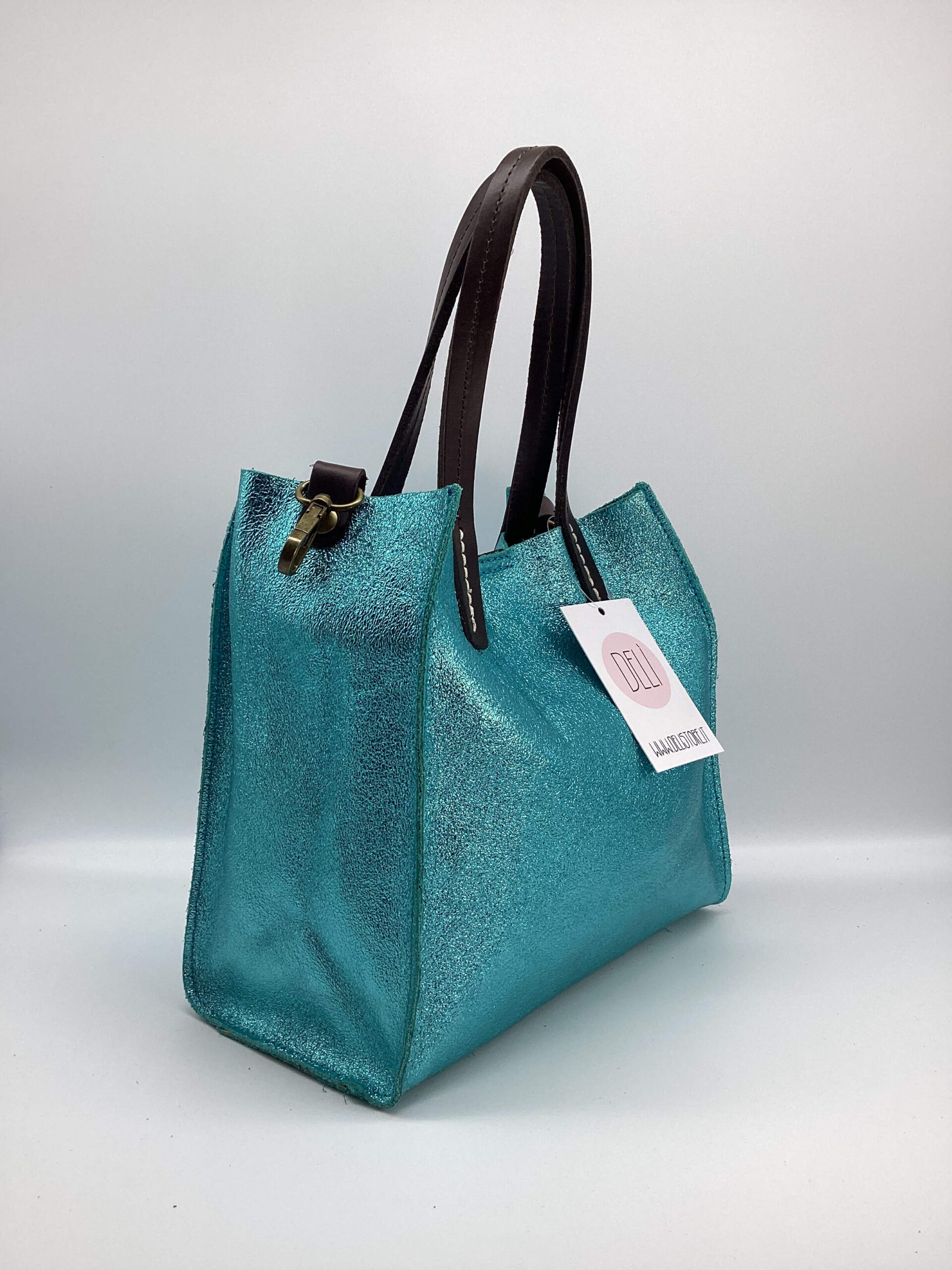 Pelle laminata con manici in cuoio colore testa di moro e chiusura con bottone magnetico, interno in pelle sfoderata.