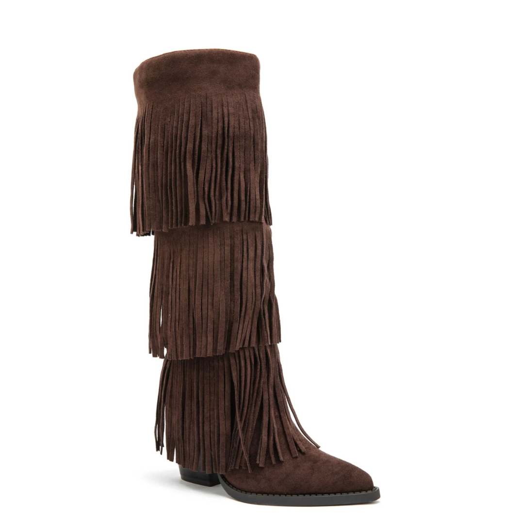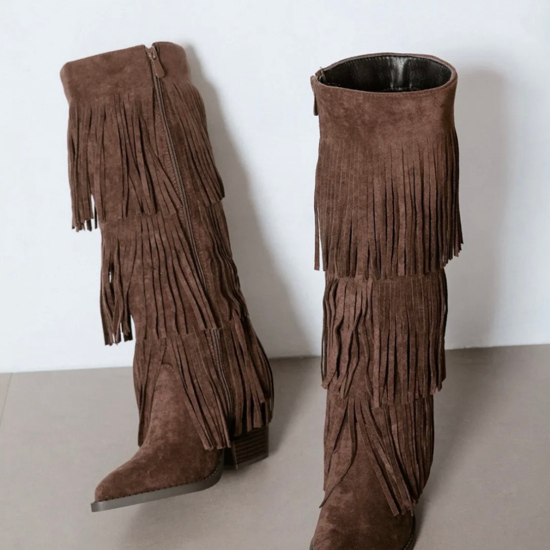 Altezza stivale fino sotto al ginocchio, con tre livelli di frange che creano un effetto dinamico e voluminoso.